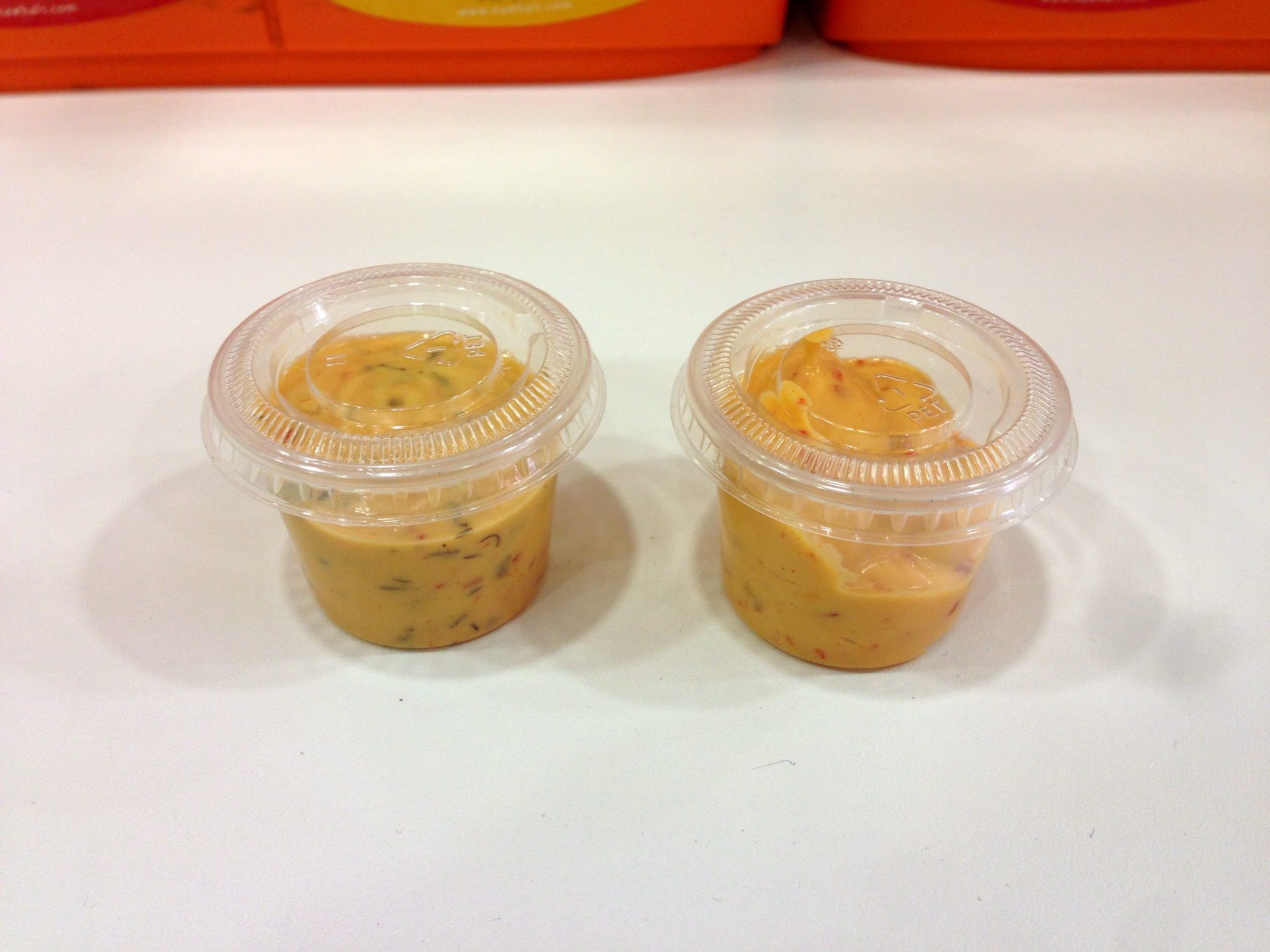 – Enfin pour terminer, ce qu’il m’a plus surpris, c’est les sauces, on doit les choisir soit même aux tireuses avec des petites capsules en plastique : pas mal pour la variété, mais bof pour l’hygiène et dans le cas où il y a un rush, je me vois mal refaire la queue pour prendre ma sauce… ! A revoir.