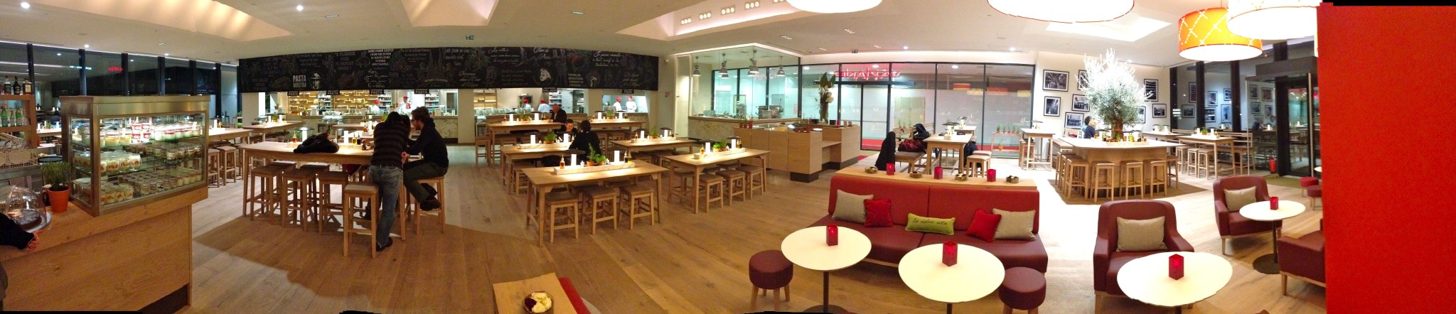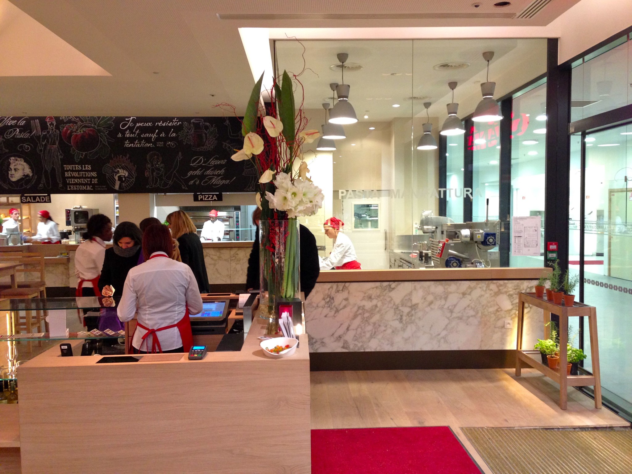 Mise à jour du 23 novembre 2018 : Je viens d’y aller à midi cette semaine, et c’est toujours la catastrophe (j’y suis déjà allé en tout 4 ou 5 fois avant celle-ci) : le personnel est mou et démotivé, c’est très lent. J’ai attendu ma pizza 20 minutes pour la manger en 15 minutes. C’est cher et pas pratique : on passe notre temps à attendre notre plat plutôt que partager notre repas avec les convives… Et pourtant nous étions arrivés à 12H00 ! Bref, à revoir : le concept, les équipes (service) et la motivation ! Seuls points positifs: les personnes qui servent les pâtes et préparent les pizzas, ils sont souriants et font de belles portions, notamment pour les pâtes ! A revoir aussi l’état des WC : déplorable. Voici quelques photos de ce midi :