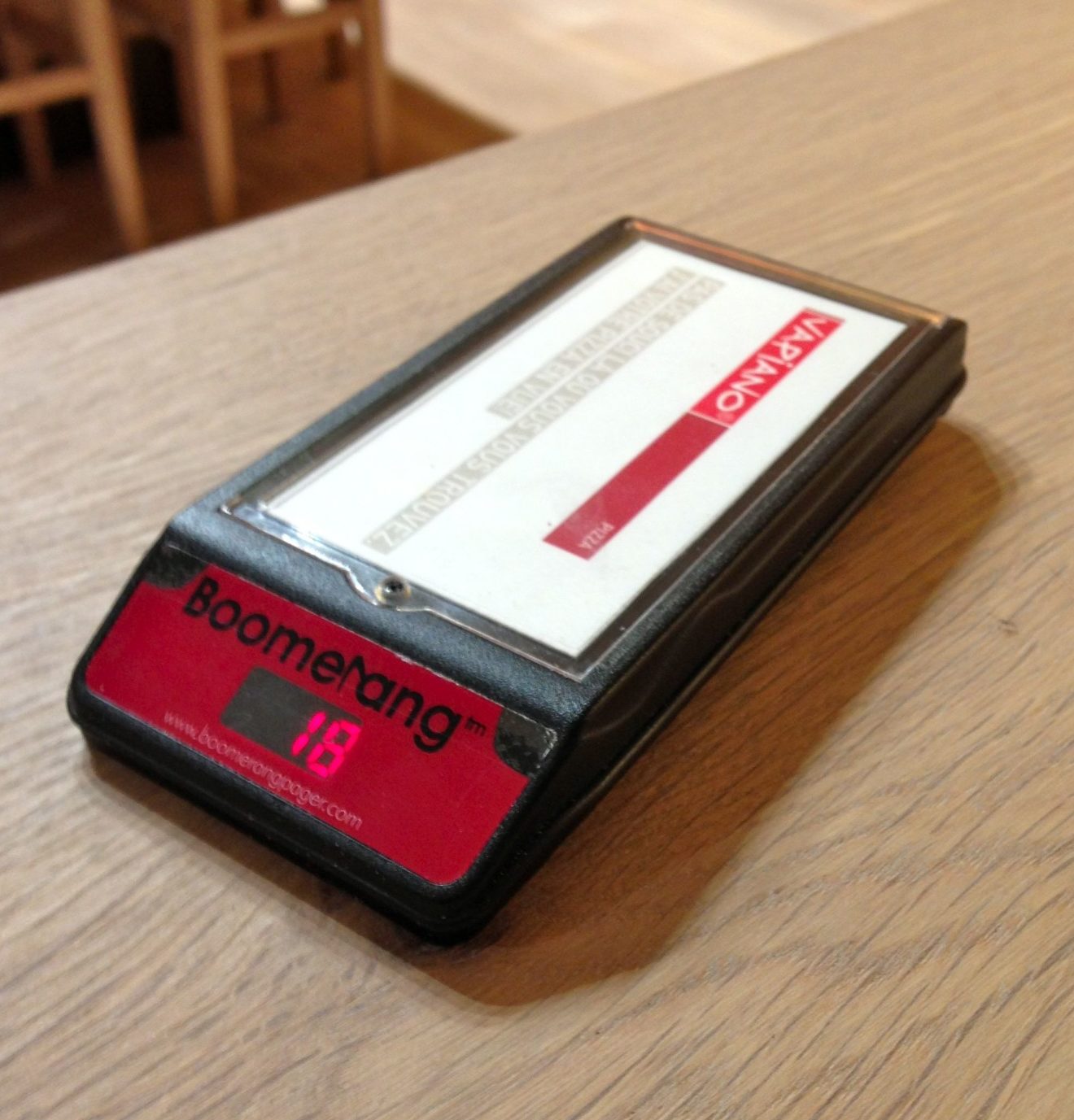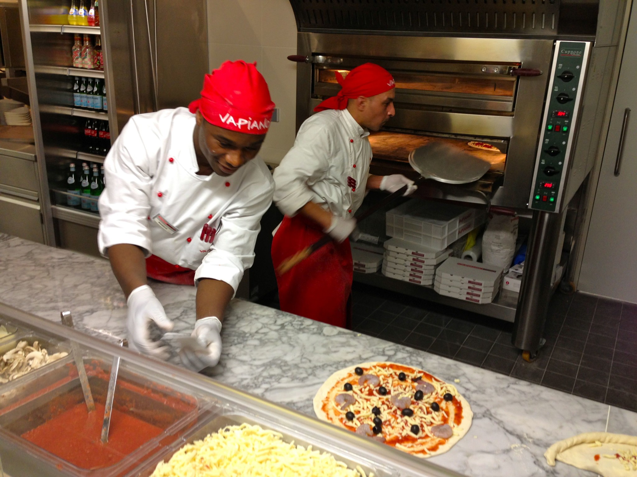 Pas grand monde en ce jeudi soir, je compte 12 clients pour autant de serveurs pour environ 240 places assises… (l’endroit vient d’ouvrir aussi, et nous sommes jeudi soir, je le rappelle…). Nous commençons par un verre de vin chacun (pas mal de variétés, servi au verre). Puis après quelques gorgées, les mecs se dirigent vers les pizzas, leurs cartes en main, et les nanas vers les pâtes. Les cuisiniers sont assez sympas, les produits ont l’air de qualité, tout est préparé devant nous. Du coté des pastas, ça prend un peu de temps, mais elles sont faites maison, et il y a la possibilité de prendre des pâtes complètes alors… Quant aux pizzas, on nous confie un “vibreur” qui nous indiquera, donc , par vibration quand notre pizza sera prête : amusant et pas con !