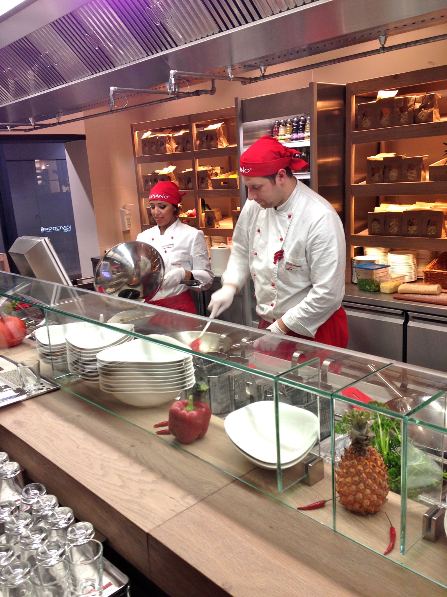 Le concept est original. Il faut retenir que c’est à la frontière de la grande brasserie et du restaurant “chaine” type Casino. En effet, il n’y a pas de service à la place. Chaque client fait la queue devant l’un des cuistot qui prépare une des propositions de la carte. Chaque cuistot est spécialisé : pâte, pizza, salade.