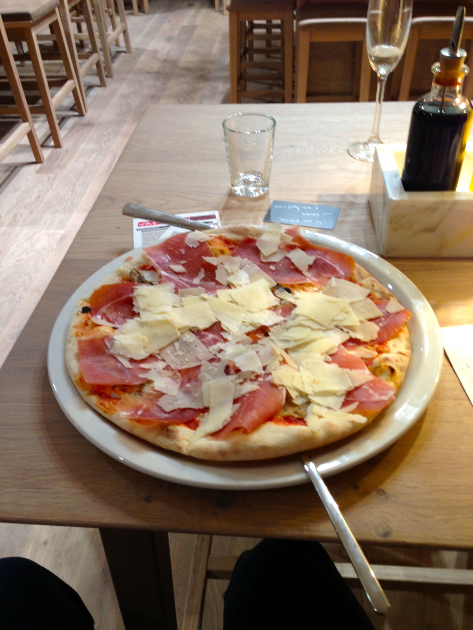 Ok, j’y suis allé en plein rush (12h30). J’ai attendu ma pizza pendant 25 minutes, quand la personne qui m’accompagnait avait déjà eu le temps d’avaler son plat de pâte : un problème de convivialité certain.