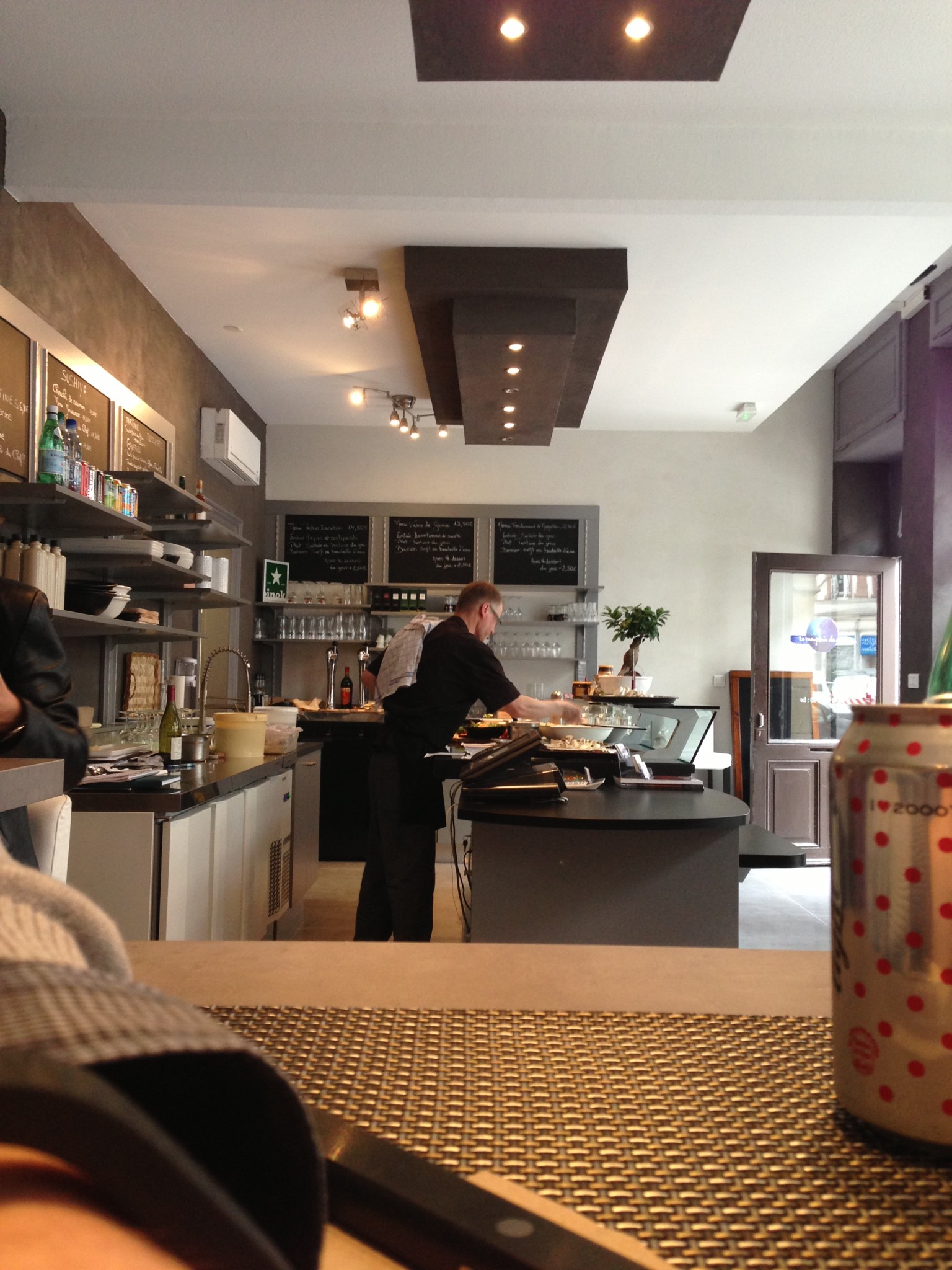 Placés face au mur, à côté des toilettes alors qu’il y avait des tables libres bien plus agréables mais bon… passons… tartine pas mauvaise mais rien de fantastique et chère. La personne qui était avec moi a pris une salade (en plat) et là, c’était limite honteux, salade en sachet avec 3 ravioles posées dessus. la sauce était surement bonne mais à 15€ la salade on peut espérer avoir un peu plus à manger.