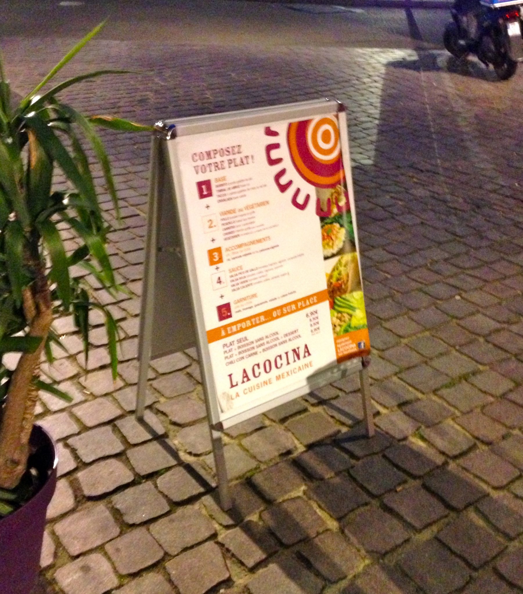 A la recherche perpétuelle du bon plan pour manger bon et pas cher à Strasbourg, je suis tombé sur le dernier restaurant mexicain en date : LACOCINA tout en bas de la Grand Rue. Il s’agit pas vraiment d’un « vrai » restaurant mais plutôt d’un petit point de vente avec quelques tables dont une petite terrasse.