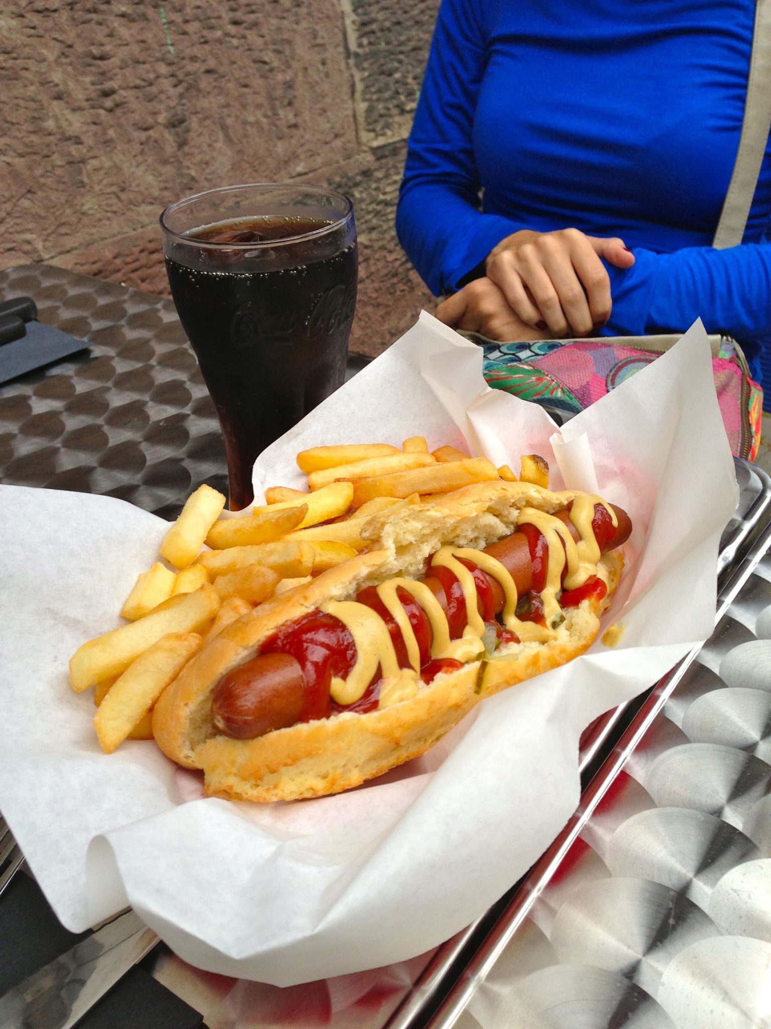On commande et on s’installe dehors : accueil cordial, sympa, esprit familial, environ 6 personnes bossent sur place entre le service et la cuisine du coup, on n’a même pas eu le temps d’attendre, servis très vite et très bien. Les portions sont généreuses et qualitatives : les frites petites mais charnues, la viande fraiche et hachée maison 2 fois par jour (dixit un serveur), pain fait maison.