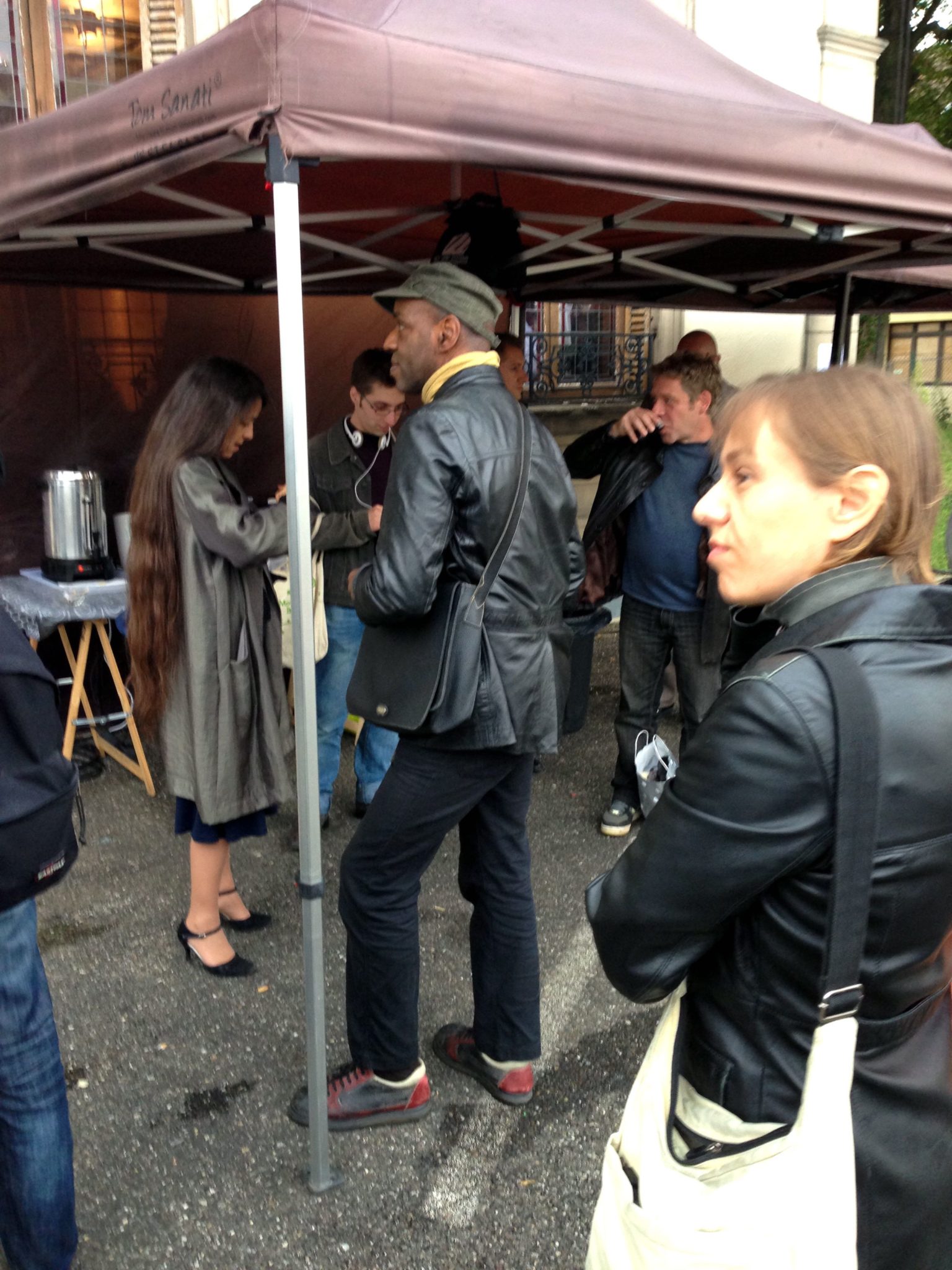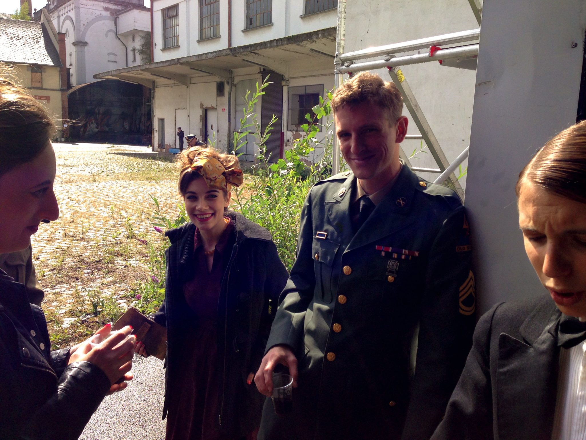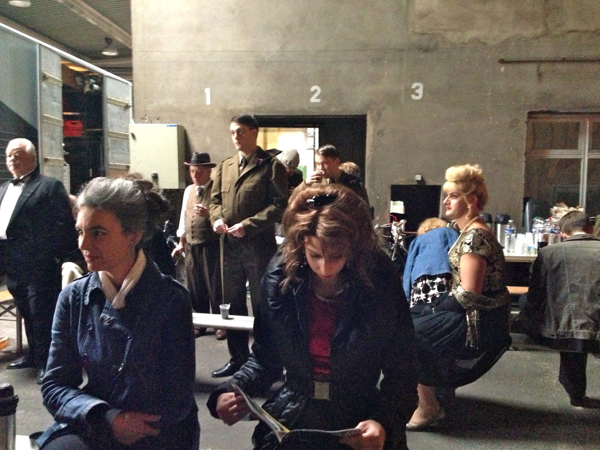 Concernant le coté figuration, tout était bien organisé : costumes, coiffure maquillage, repas, café, café, café…. Tout a suivi sans accroc à part peut être la météo dégueulasse de ce mois de septembre à Strasbourg ! Sinon, on a eu le droit à de la danse endiablé, à aussi pouvoir fumer comme des pompiers sur le plateau du cabaret, à boire de la fausse bière : Canada Dry et être enivré par des reines de la nuits et un groupe jazzy, bref il y a pire comme ambiance non?