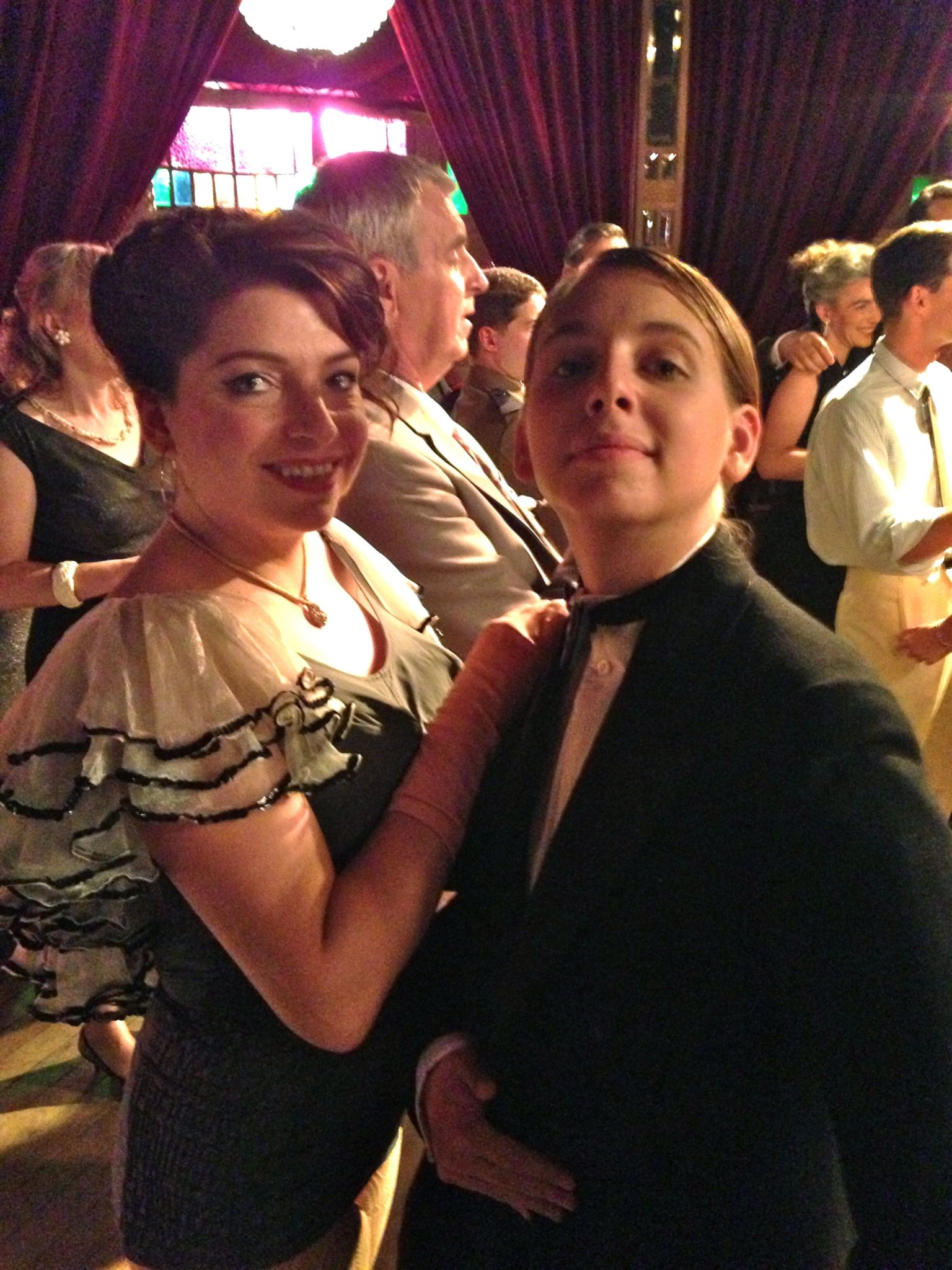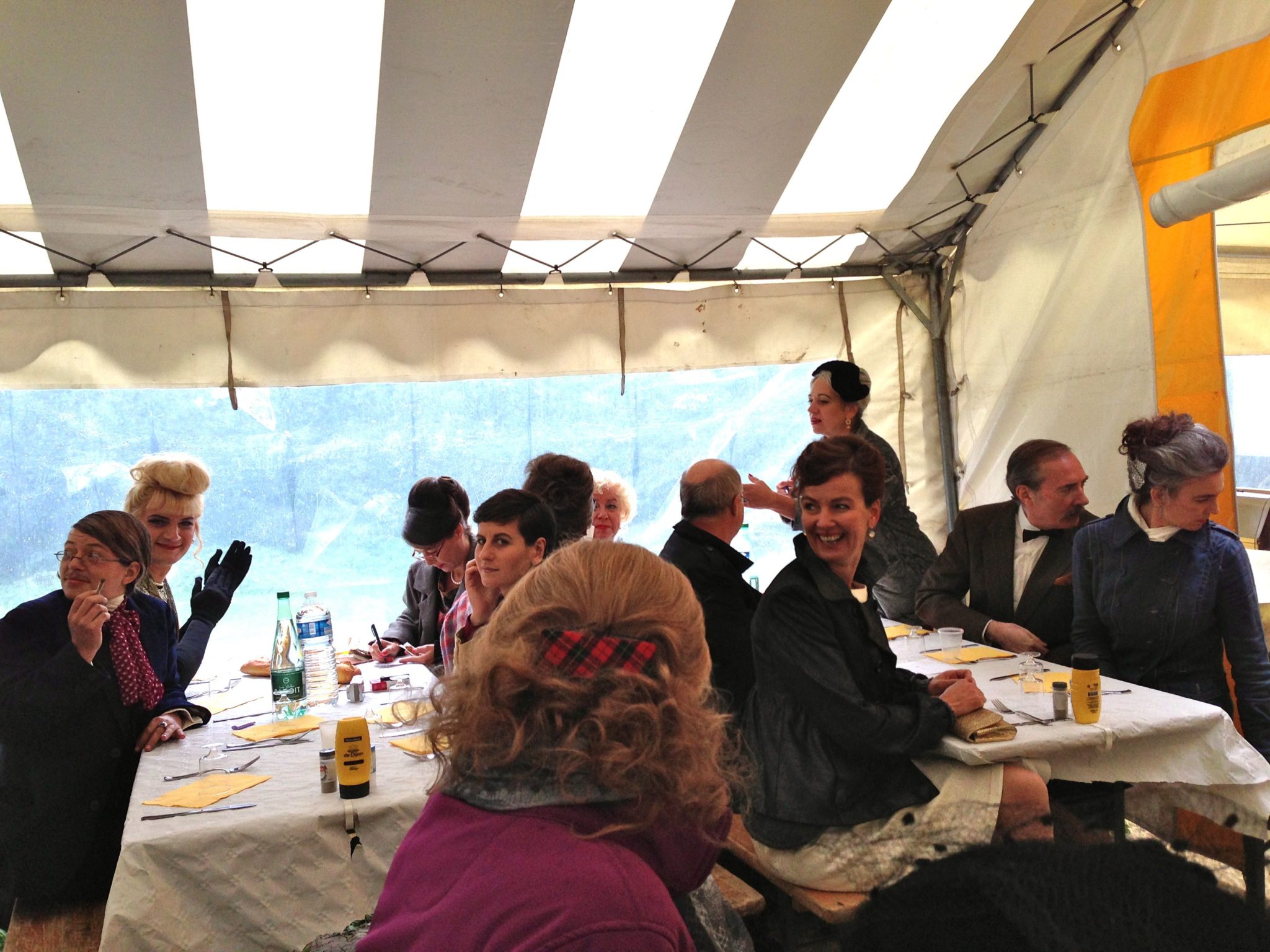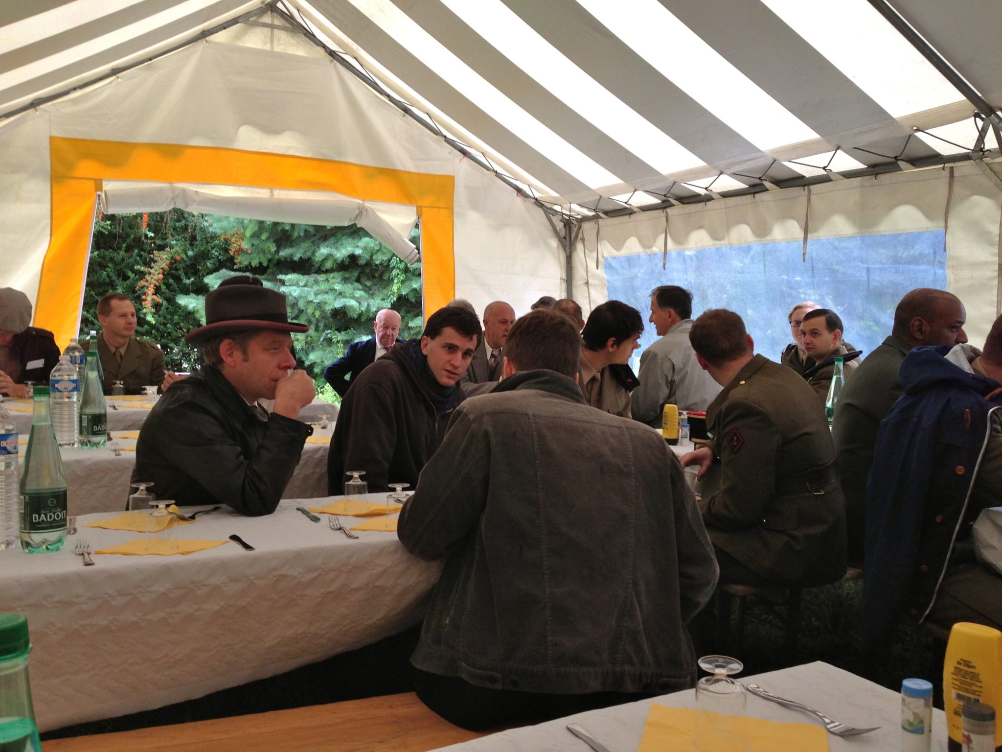 Concernant le coté figuration, tout était bien organisé : costumes, coiffure maquillage, repas, café, café, café…. Tout a suivi sans accroc à part peut être la météo dégueulasse de ce mois de septembre à Strasbourg ! Sinon, on a eu le droit à de la danse endiablé, à aussi pouvoir fumer comme des pompiers sur le plateau du cabaret, à boire de la fausse bière : Canada Dry et être enivré par des reines de la nuits et un groupe jazzy, bref il y a pire comme ambiance non?