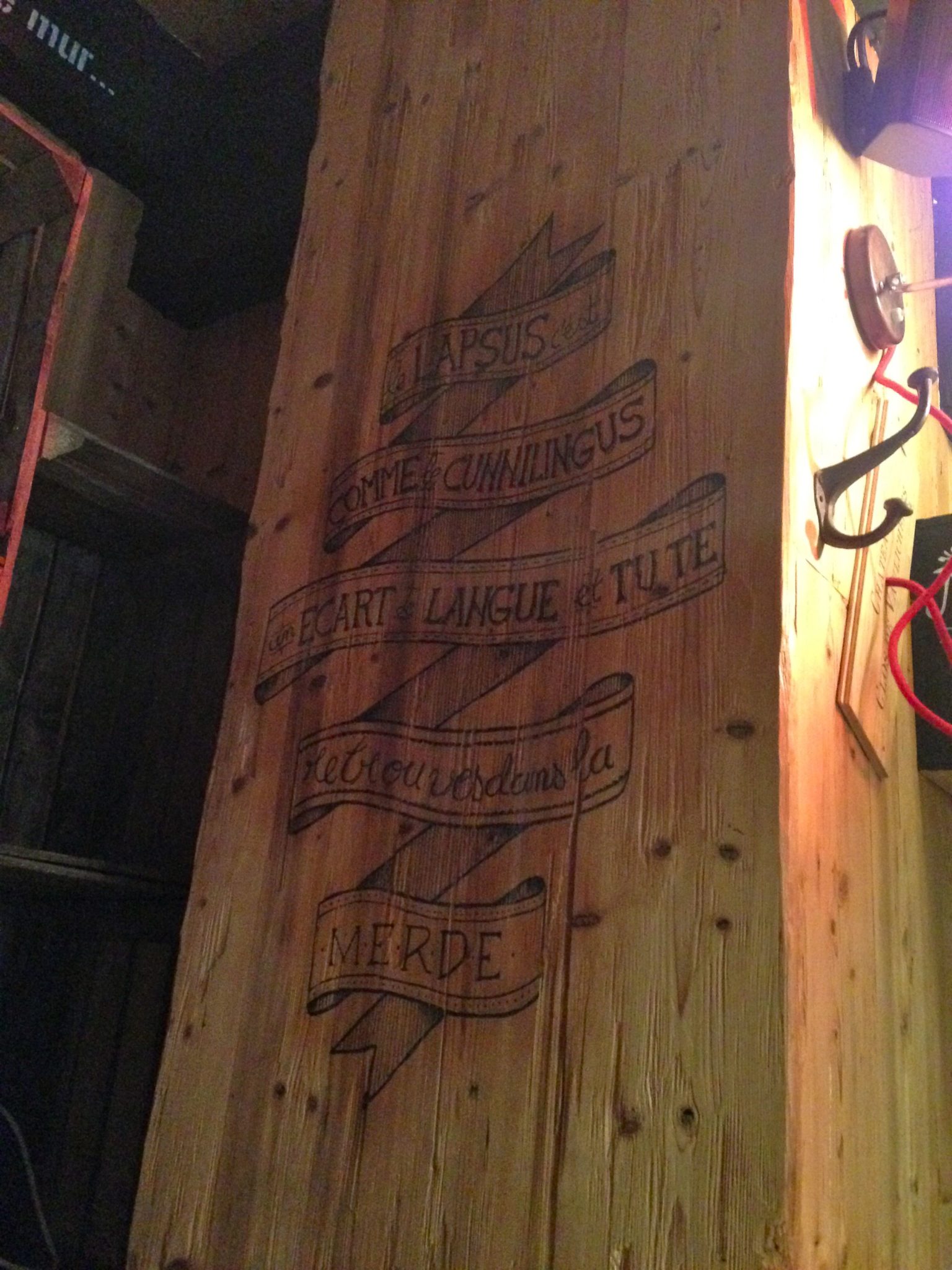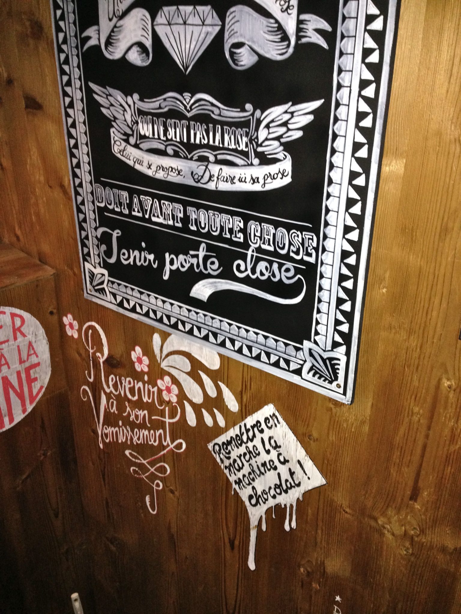 – Décoration : à l’ambiance montagnarde du précédent resto, c’est greffé une galaxie d’accessoires et d’expressions ( amis de la poésie vous allez être comblés, je vous invite à lire avec attention les murs des WC). On y retrouve tables hautes, des tables en formica et même des tabourets “bouchons”. Avec en plus, un petit coin avec des fauteuils pour un apéro tranquillou.