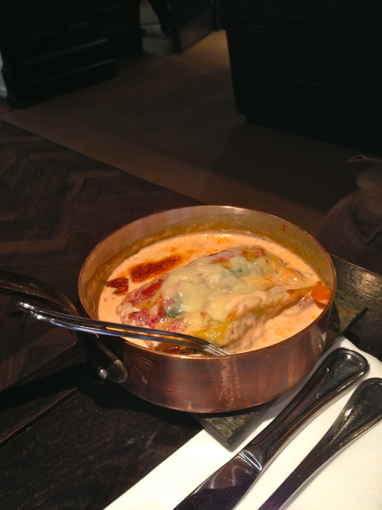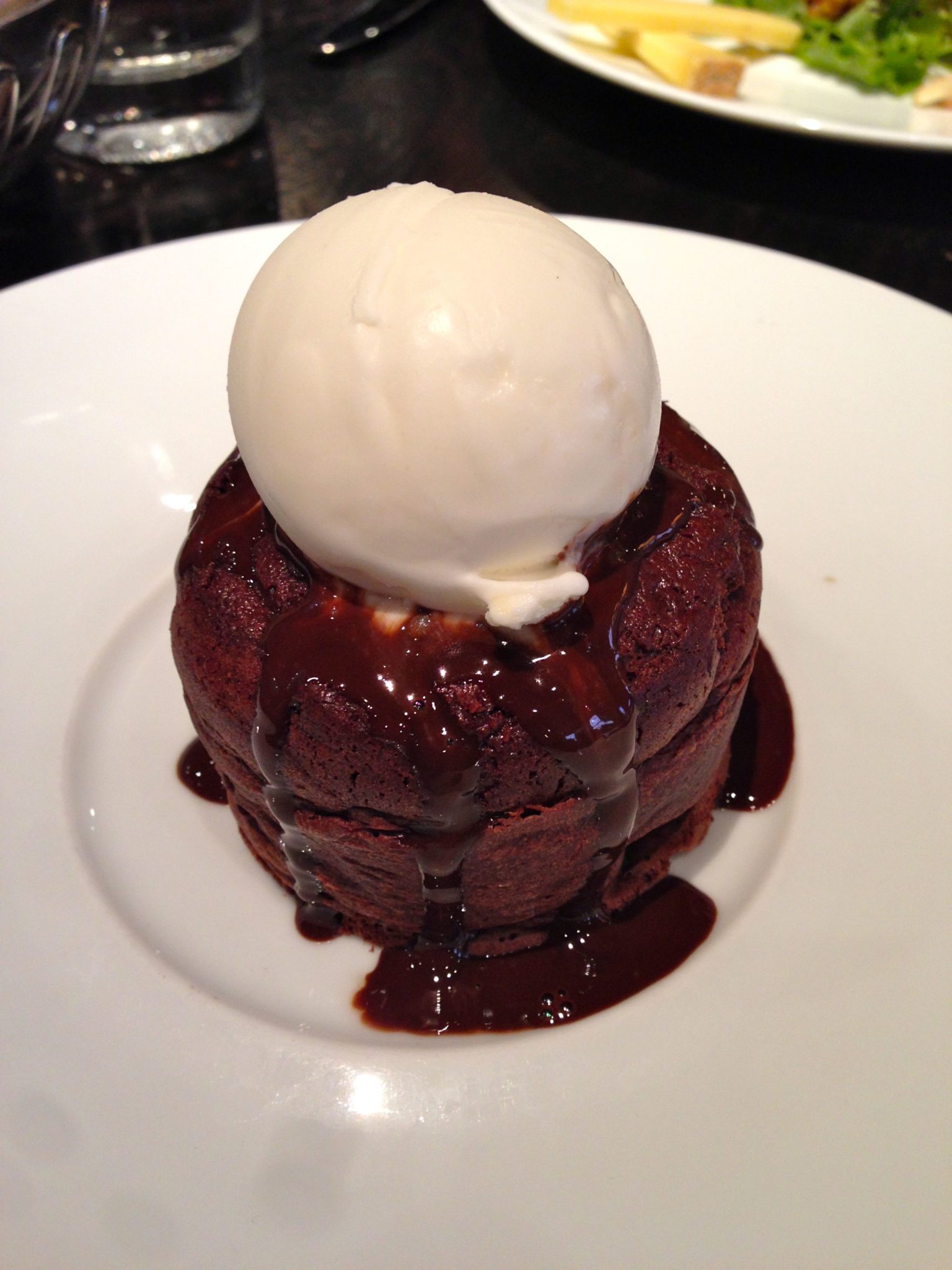 J’ai opté pour pour le menu à 17€ avec un tartare de bœuf et un moelleux au chocolat. Concernant le tartare, il est assez bien présenté mais tout de suite j’ai senti que le cuisinier s’était lâché sur les assaisonnement : trop relevé, j’avais l’impression qu’il y avait plus de moutarde que de viande de bœuf… J’aurai préféré qu’on me demande avant de le préparer ou que je le fasse moi même ! Quant aux mini frites, c’est original mais ça manque de chaire, on a l’impression de manger des chips chaudes… Les cannelloni épinards ricotta de ma partenaire de table était meilleures, servies dans une petite casserole chaude en plus.