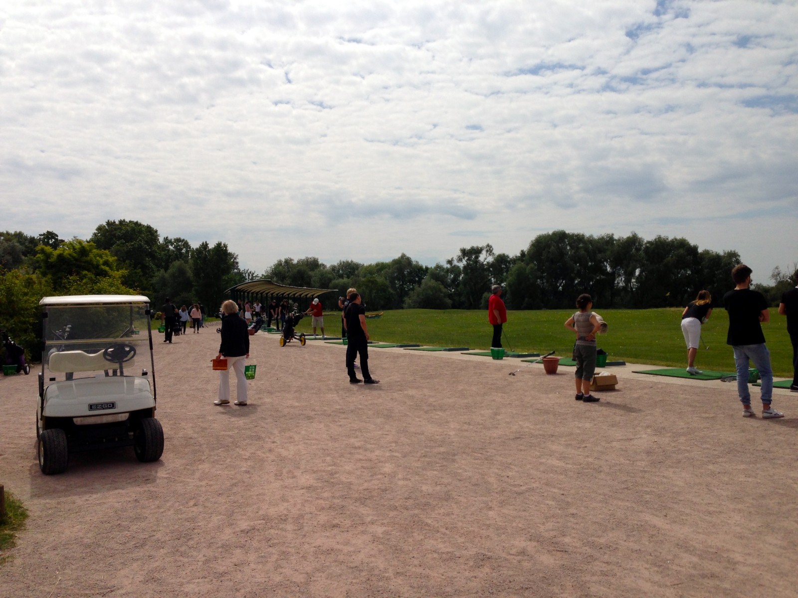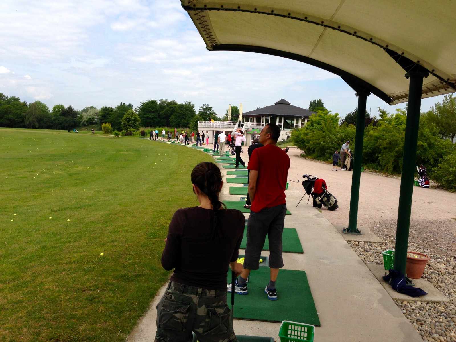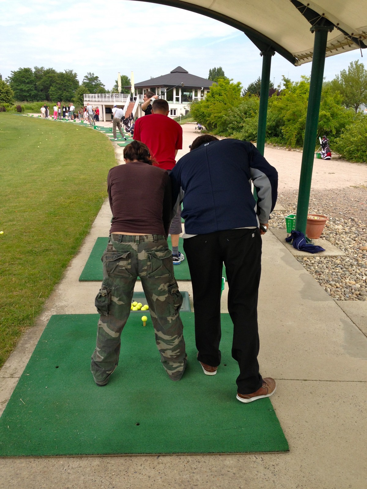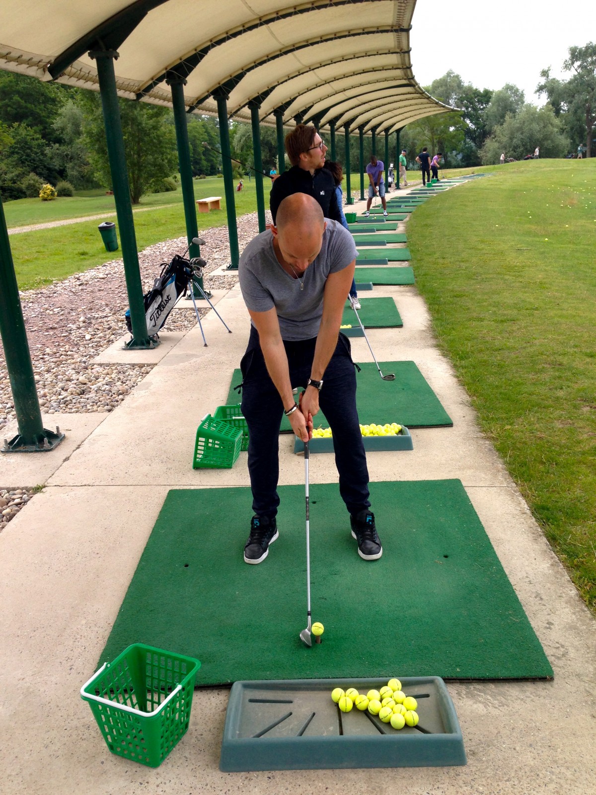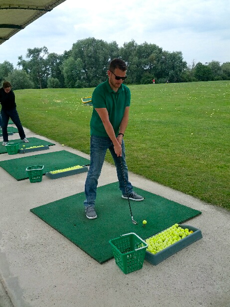 Nous étions un petit groupe de 9 personnes ce matin, tous motivés à en découdre avec ce sport. Accueillis par un des profs du club, Lucas, le Maxime Musqua local (si vous le voyez, vous comprendrez pourquoi je dis ça), nous nous dirigeons vers le pratice pour taper quelques balles. Après une explication sommaire mais efficace, Lucas, nous laisse donc nous déchaîner sur ces malheureuses balles de golf jaunes tout en reprenant nos mauvais gestes au fur et à mesure. L’ambiance est plutôt cool, les conseils et le prof parfaits, on passe donc une bonne heure à taper et retaper en variant nos clubs et en analysant nos trajectoires respectives.