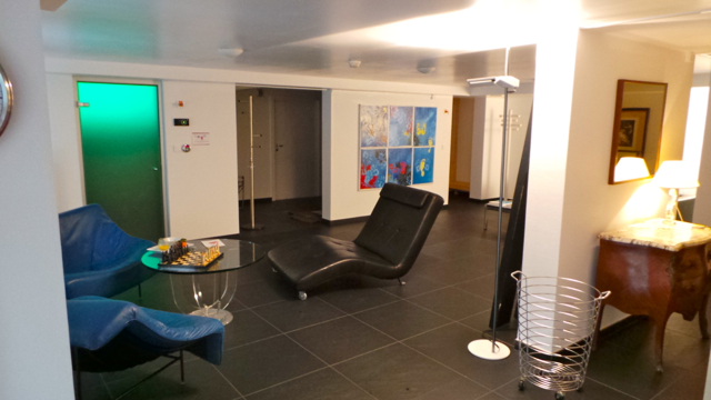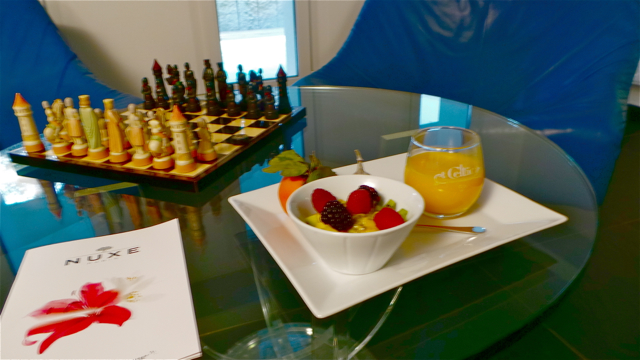 Puis, on a l’accès au spa qui comprend : un hammam, un jacuzzi et un sauna, le tout dans un cadre soigné et un décoration très « art déco » (fauteuils Le Corbusier). On nous sert une eau aux agrumes et une collation aux fruits frais dans un parfait timing… On se retrouve dans une ambiance un peu hors du temps où le timing que l’on surveille c’est celui du jacuzzi : très agréable.