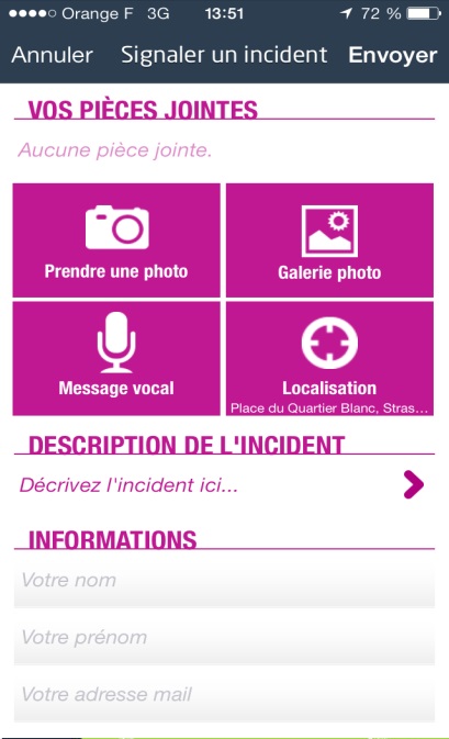 Vous êtes sur une piste cyclable endommagée ? La signalisation est manquante ? La fonctionnalité « Signaler un incident » vous permettra d’informer les autres cyclistes de tout dysfonctionnement. L’incident sera pris en compte par les services techniques du Conseil Général du Bas-Rhin et sera mis en ligne rapidement pour qu’il soit visible dans l’application mobile par tous les internautes.