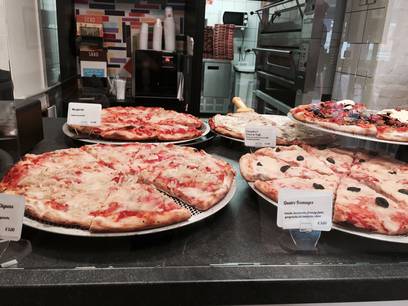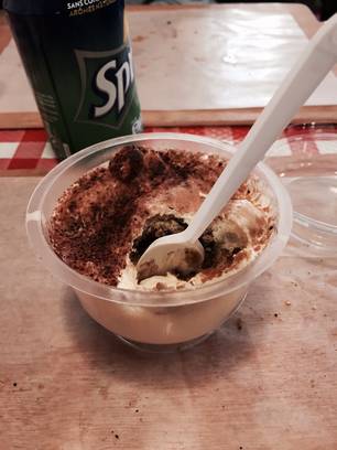 En cette semaine d’avant Pâques, le temps est chaotique et on peut pas dire qu’à midi la foule se bouscule dans la pizzeria… Après un accueil tout aussi froid du patron (seul apparemment dans boutique) je me décide a commander. Le midi, ils proposent des formules : parts de pizzas + boisson et dessert. C’est très simple, pas cher alors j’opte pour 2 parts de pizzas (différentes), un coca light et un tiramisu. Le temps de réchauffer (dans un vrai four à pizzas) mes parts, j’observe l’ambiance, très simple, pas trop recherchée mais sympa. Par contre, niveau musique c’est le calme plat, pas un bruit… J’aurai aimé une radio italienne, voir même accepté l’intégrale d’Eros Ramazzoti plutôt que ce silence… Bref, mes pizzas sont chaudes, le chef me les ramène sur une planchette, elles sont bonnes, croustillantes, et copieuses : 2 parts m’ont suffit mais j’aurai pu me laisser tenter par une 3ème gourmand que je suis ! La boisson est servie en canette, à nous de se lever pour chercher le gobelet qui va avec. Je finis par le tiramisu, visiblement fait maison, plutôt bon, voir même très bon, pourtant je n’aime pas le café ! L’endroit c’est bien rempli entre temps, entre actifs strasbourgeois et touristes de passage. Le repas est bouclé en 30 minutes, parfait !