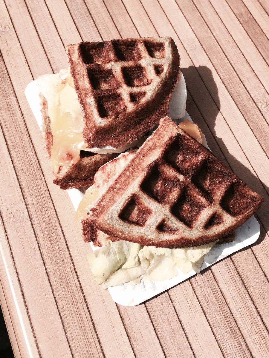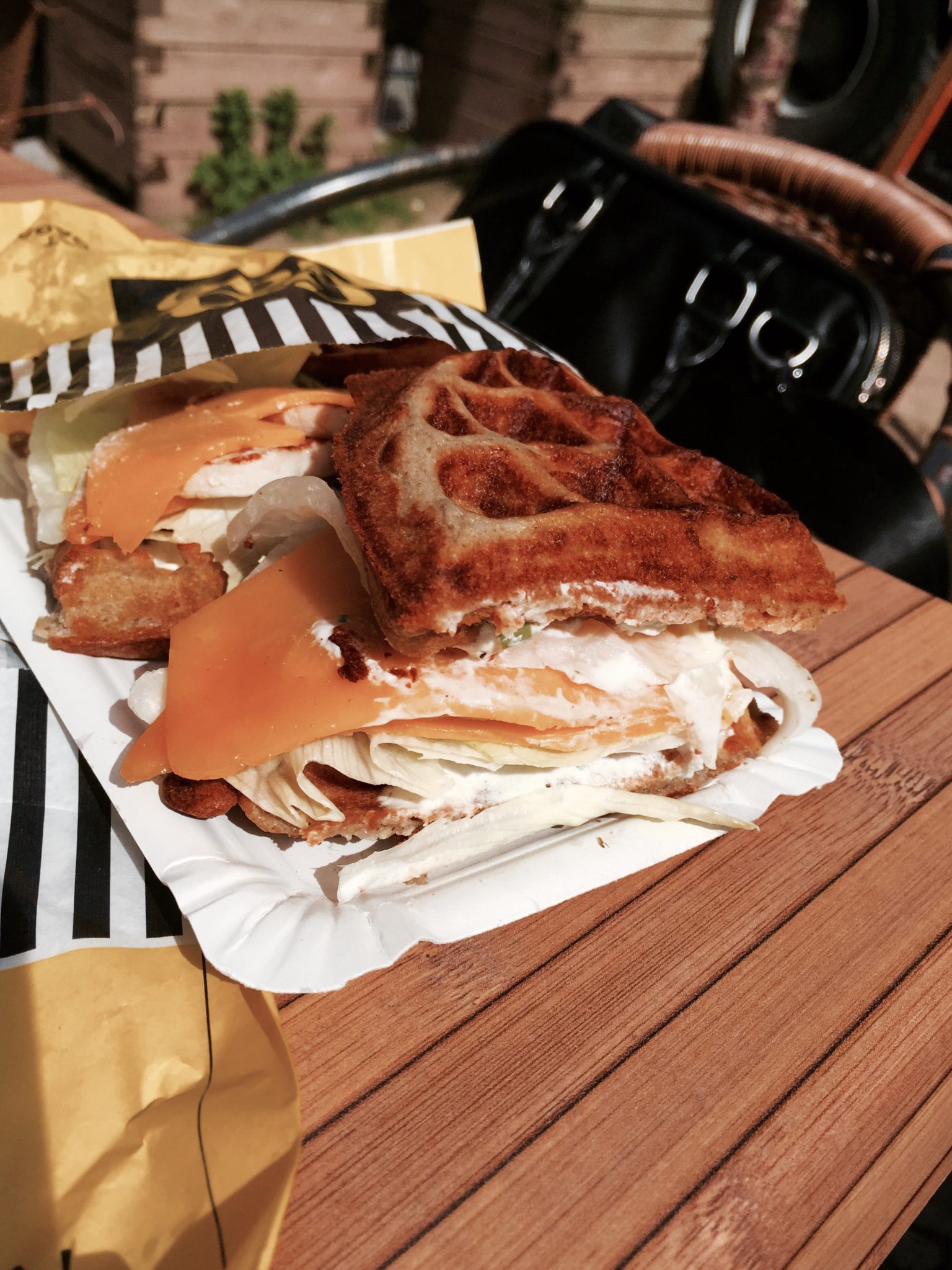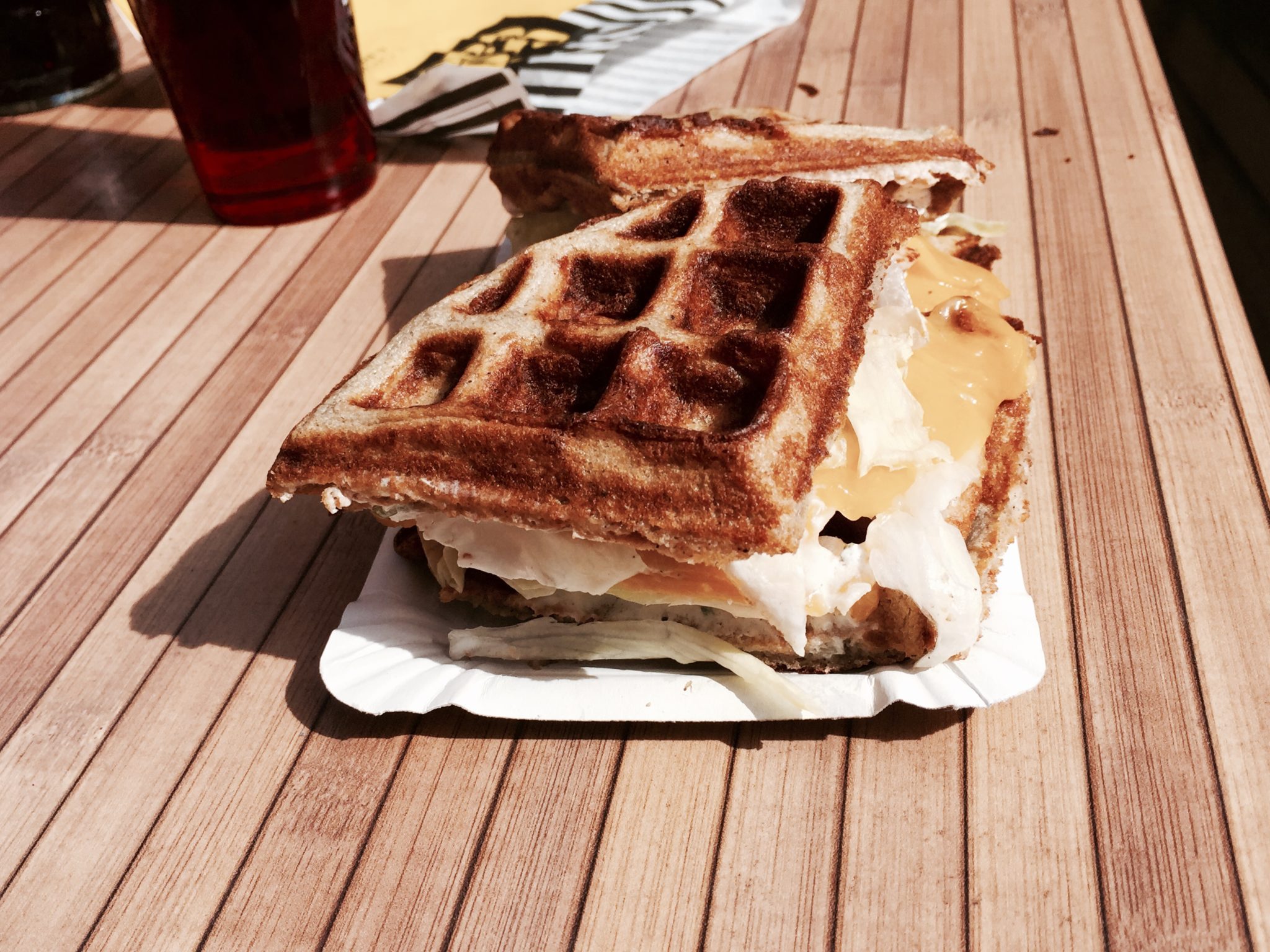 La dégustation commence : la gaufre est bonne, assez copieuse malgré sa taille, et bien assaisonnée. Cependant je la trouve un peu grasse, ça doit venir de la cuisson de la gaufre mais pas de sa garniture. Pour le dessert, j’ai un peu plus de mal avec le carrot cake, qui a un glaçage à mon gout trop sucré, et une structure assez sèche : mais je ne suis pas expert du genre, j’ai voulu essayé alors j’assume !