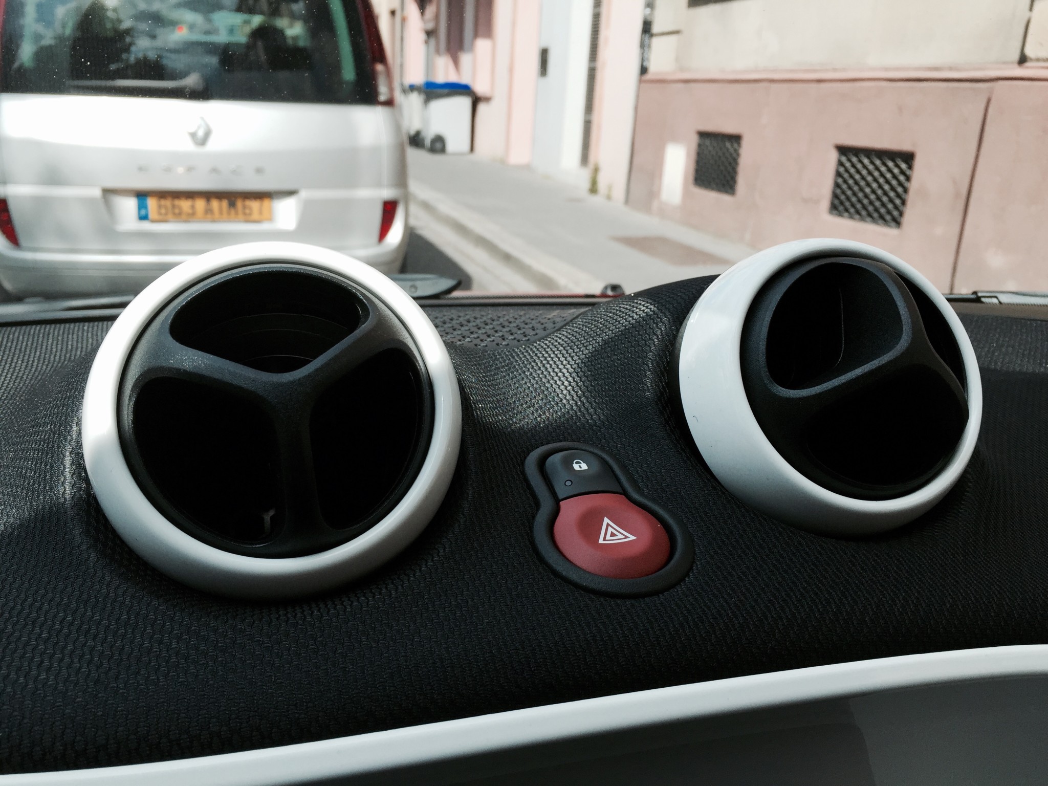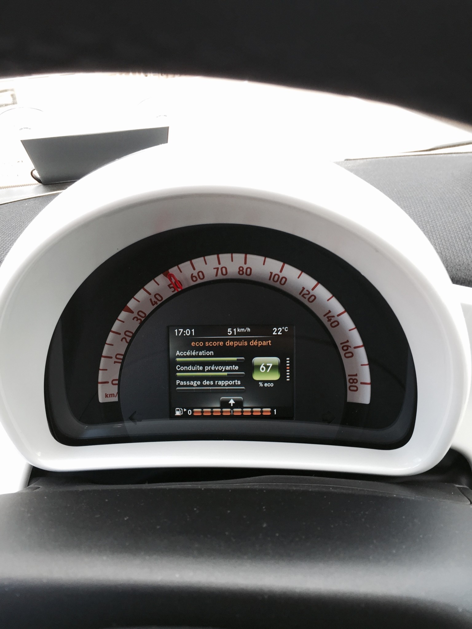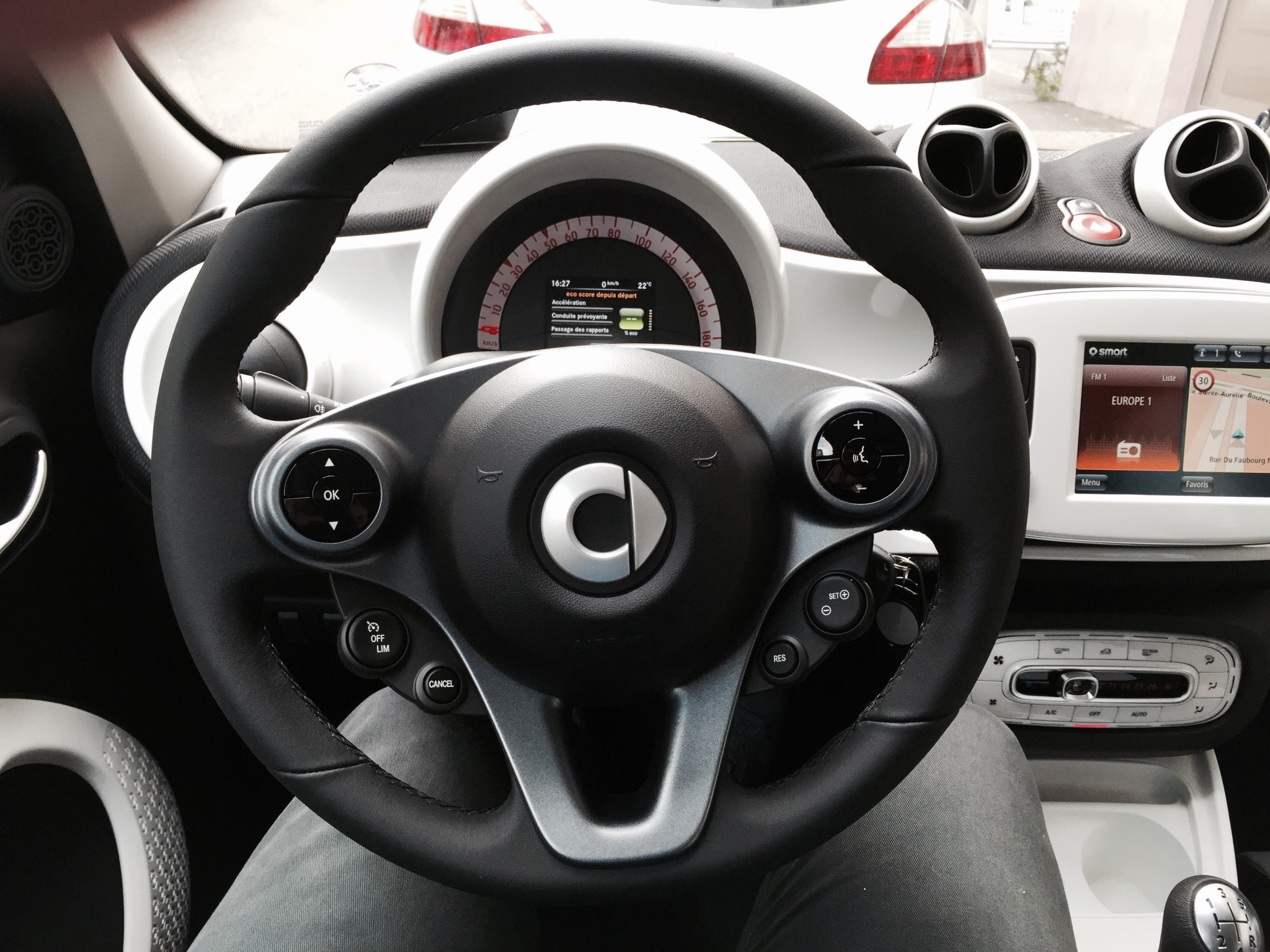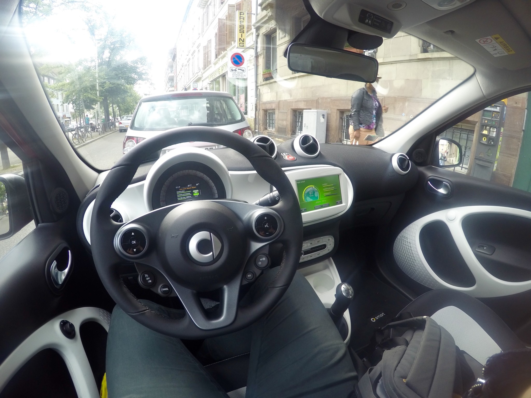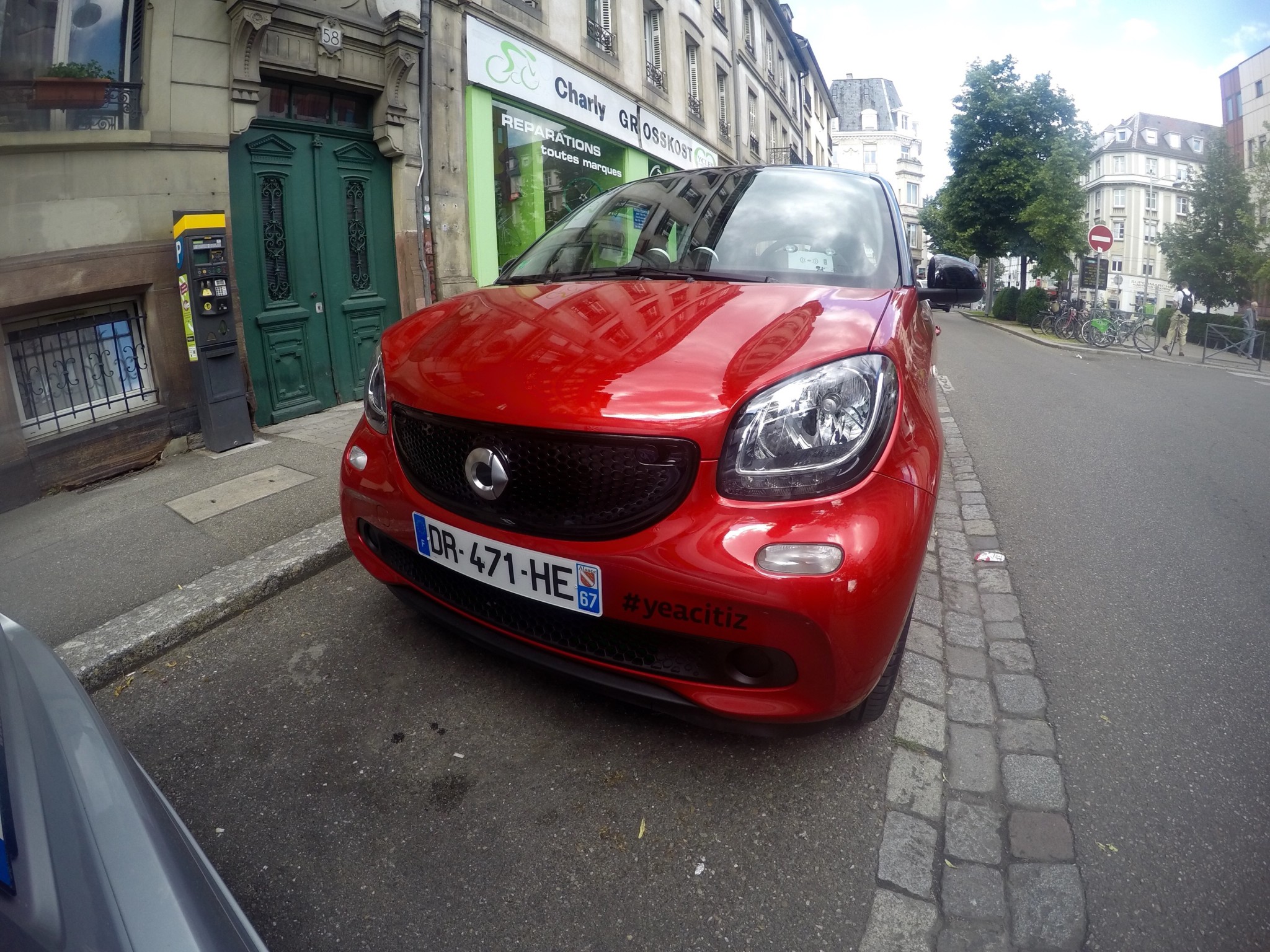 Il s’agit de la nouvelle SMART FOR FOUR noire et rouge telle une petite coccinelle urbaine. Un peu surprenant comme choix, je trouve mais sympa à conduire : assez haute (pratique pour les personnes âgées), assez sport pour l’intérieur, rayon de braquage optimisé (idéal pour les créneaux), bien équipée (j’ai bien aimé la tablette (idem RENAULT R-LINK) avec le GPS).