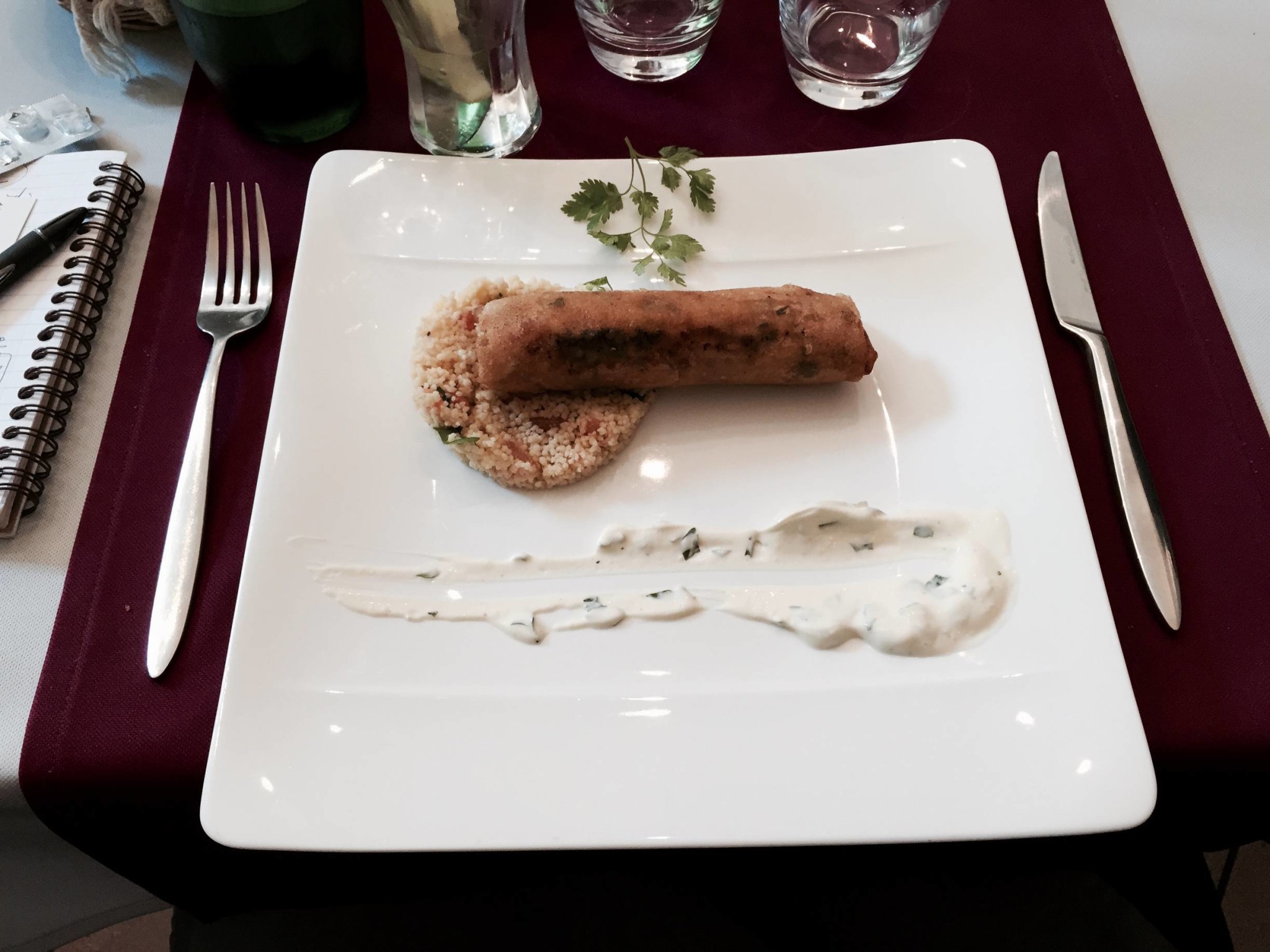 Après réservation préalable, on arrive dans cette grande salle où la climatisation est au taquet ! (ce jour là, il faisait 30°C dehors, mais bon, fallait mettre un pull à l’intérieur !), on s’installe et on s’attaque au choix : rapidement, on se fixe sur la formule entrée + plat à 14€50, qui parait correcte (il y avait un choix de chaque). Je pars sur le croustillant de poulet tandoori, taboulé de damas en entrée, puis une brochette de rumsteck de bœuf, galette de pommes de terre, carotte fane glacée et sa sauce béarnaise. Il y avait aussi en plat du poisson (selon arrivage) avec sa petite tartelette aux légumes du soleil confits et une salade de roquette.