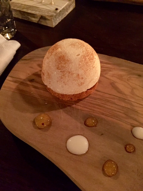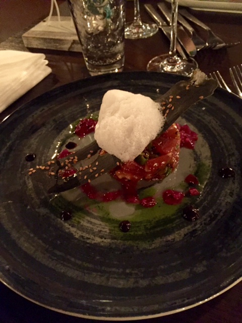Pour les entrées, on a eu le droit à une tarte fine potiron et quetsches d’Alsace recouverte d’un espuma de foie gras, ainsi qu’un tartare de bœuf dans l’esprit Tex Mex.