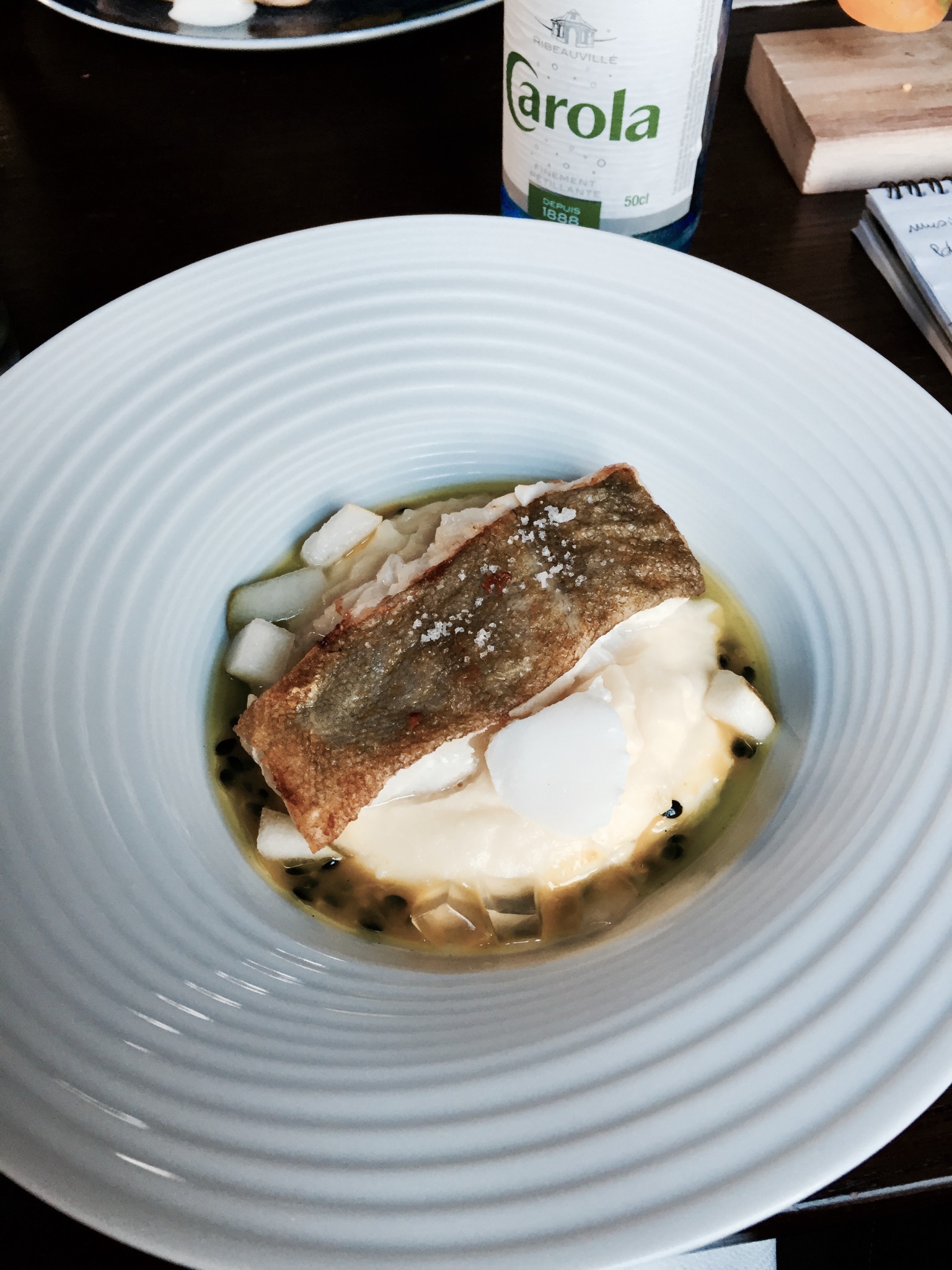 Les plats ont pas tardé à arriver, on a donc pris un dos de cabillaud juste poêlé avec une mousseline de charlotte, passion et estragon, avec comme second plat un suprême de poulet jaune, garniture dans l’esprit petits pois carottes.