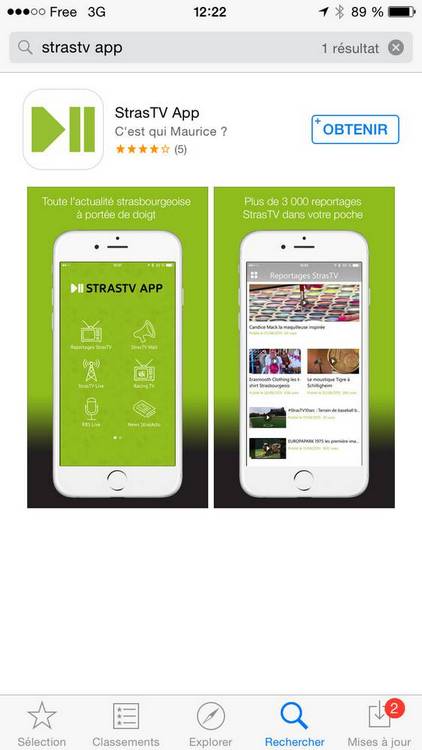 Appli lancée par l’équipe de StrasTV avec Joseph Pasquier (fondateur en 2008 de la web TV), elle s’axe vraiment sur la vidéo : suivre des événements live, revoir des reportages … Elle propose aussi la radio RBS en live et aussi un « mur » participatif : le StrasTV Wall (non testé)
