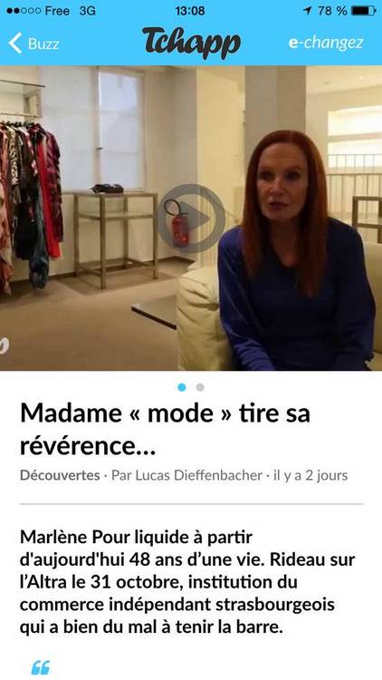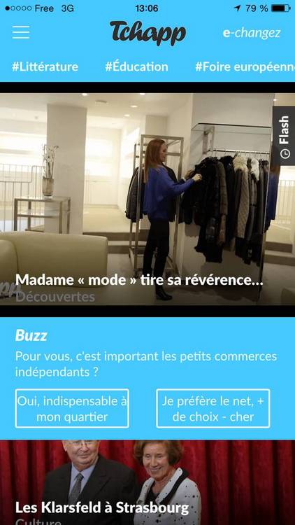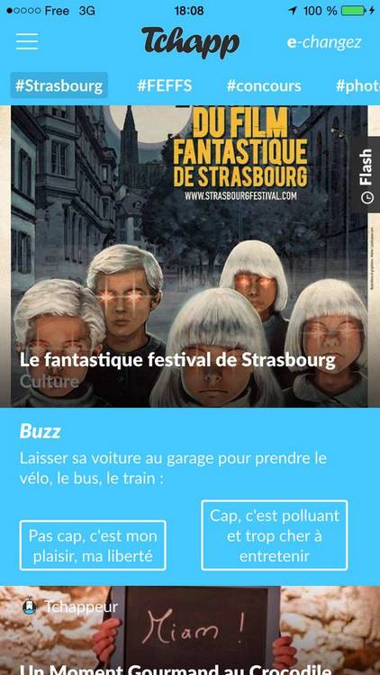 Appli lancée par Tanguy Flores de Alsace20, avec des partenaires divers , l’appli se concentre sur l’actualité alsacienne au sens large, d’ici ou même du bout du monde. Elle mise sur le coté participatif avec la fonction « e-changez » qui vous permet de soumettre du contenu à la rédaction : photo, vidéo, article etc…
