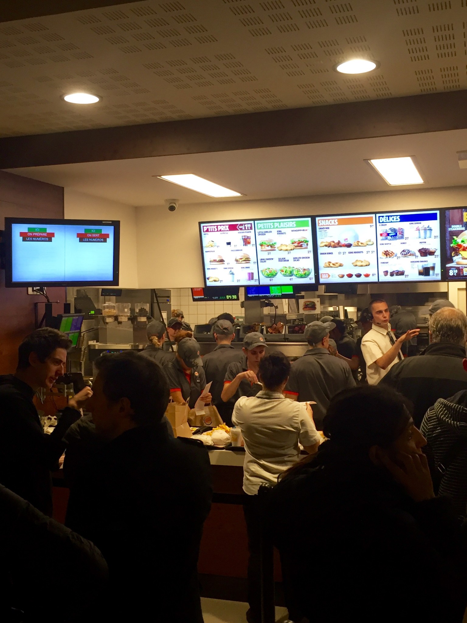 19h41 : Plein de bonne volonté, je commence la queue, sans passer par les bornes, pour avoir une vraie vision de l’attente… Ça me donne le temps de regarder la décoration : assez classique pour un fast-food, le plafond noir assombrit l’ensemble, mais j’aime bien les tables surélevées. C’est très bruyant, beaucoup de monde et on a du mal à s’entendre parler. Évidemment pour un samedi soir, il y a beaucoup de famille, et certains enfants perdent patience. En cuisine, une quinzaine de personnes en plein rush, ça fourmille dans tous les sens, on ressent un certain stress global. 5 caisses sont ouvertes (seulement?), 4 classiques, 1 pour les commandes aux bornes (4 personnes dédiées à celle ci), et bien sur le drive. Une manager régule les commande à la caisse dédiée aux bornes, elle oscille entre bonne humeur, stress et organisation : elle a beau souhaiter un “bon appétit et bonne soirée” à tous les clients, elle en recadre certains qui trainent dans la queue “faut pas dormir monsieur !”