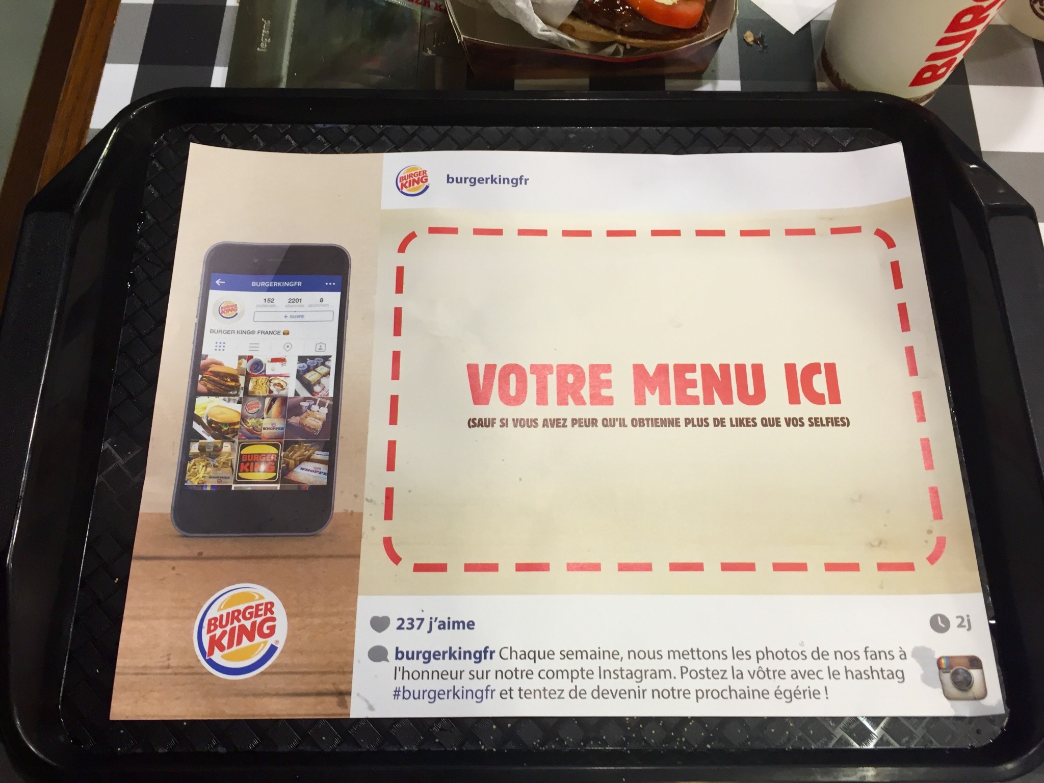 NB: j’ai bien aimé les dessous de table sur les plateaux avec l’opération Instagram, bonne idée marketing ! Pas mal aussi la possibilité de personnaliser son burger avec le bacon, fromage ou viande en option.