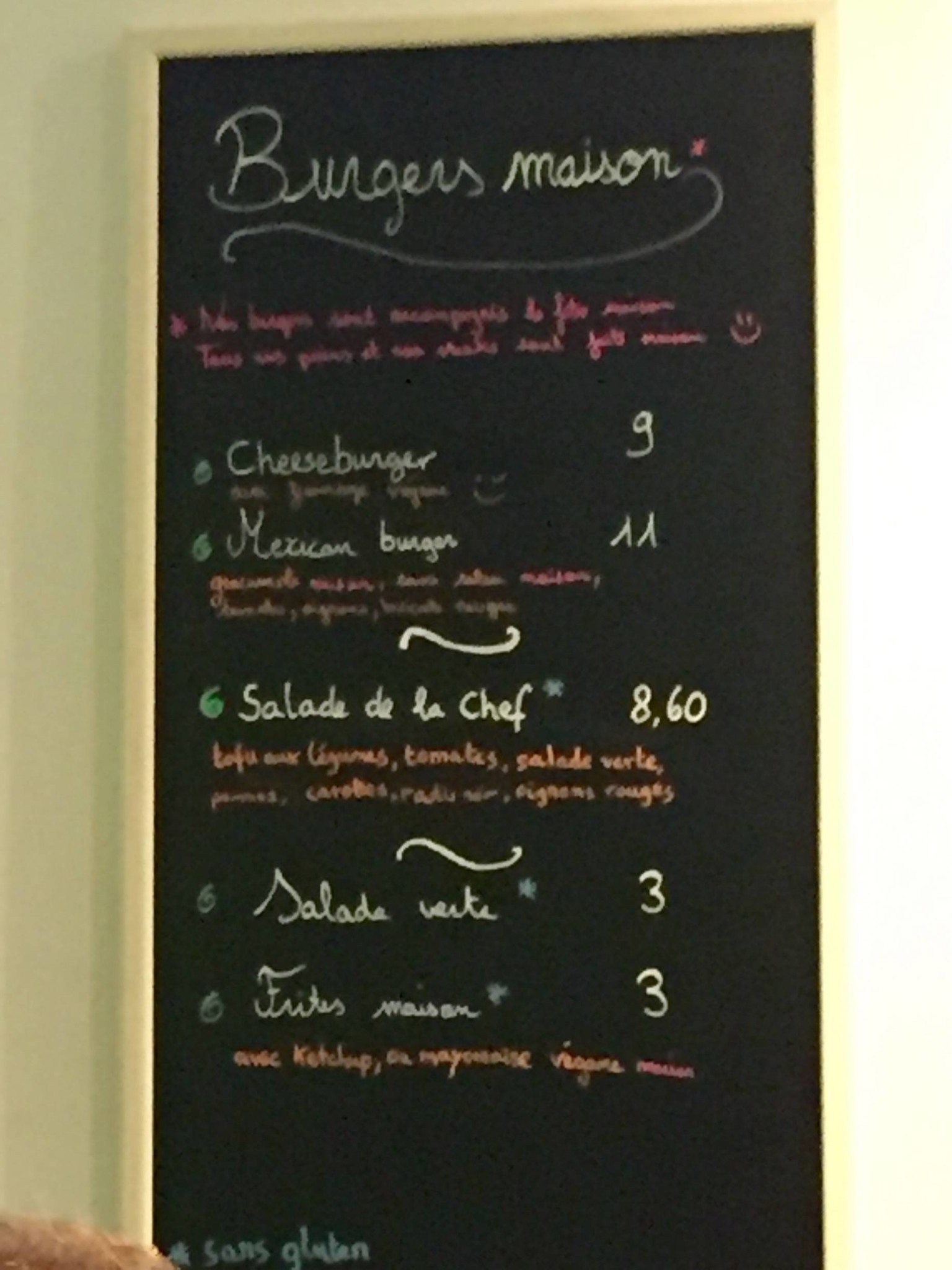 Quant à leur peu de choix, il faut savoir que dans les premiers temps, ils étaient entravés par des fonds qui traînaient à se débloquer. Maintenant, ils ajoutent régulièrement de nouveaux mets à la « carte » (toujours au tableau) : sandwichs, soupe, double-cheese, indian burger, cupcakes (fruits rouges et crème de marrons) et entremets (fruits rouges ou passion).