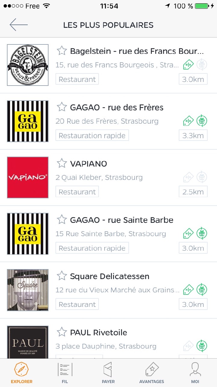 Hello, moi je teste l’appli depuis sa mise en circulation sur Strasbourg. Je l’ai découverte grâce à GAGAO, donc je citerais cette enseigne en premier. Après pour la rapidité et la qualité des produits et pour des sandwichs qu’on peut emmener partout, je citerais Subways (selon les offres, il te fais payer moins cher ou t’offre un cookies…) et enfin la troisième parce que je suis gourmande, je citerais bagelstein qui jusqu’à la fin de l’année t’offre ton menu pour l’achat d’un bagel….