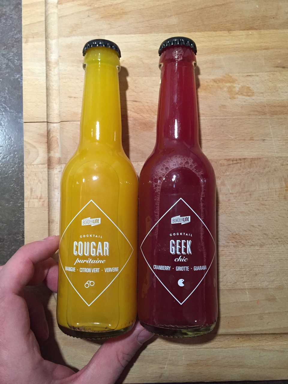 2 jus de fruits Bordeline : Cougar (mangue, citron vert, verveine) et Geek (cranberry, griotte, guarana). 2,95 euros par jus.