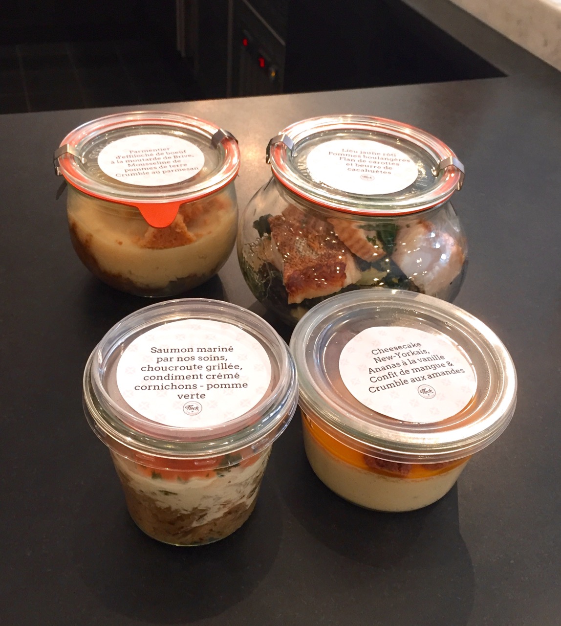 Donc une addition de 38,20 euros, payée sans problème et rapidement avec l’application Fivory. Nous voulions manger sur place dans cette très belle boutique mais ce n’est pas possible (-> déception), il a donc fallu attendre le lendemain soir, à la maison, pour déguster ces mets. Après un passage d’une demi heure au four à 140°C, les plats sont sortis ” comme neufs, impeccables, on aurait pu croire qu’ils venaient d’être cuisinés: rien à redire, très bon, et surtout très copieux. (C’est d’ailleurs pour cela que l’on avait pris qu’une entrée et qu’un dessert pour deux).