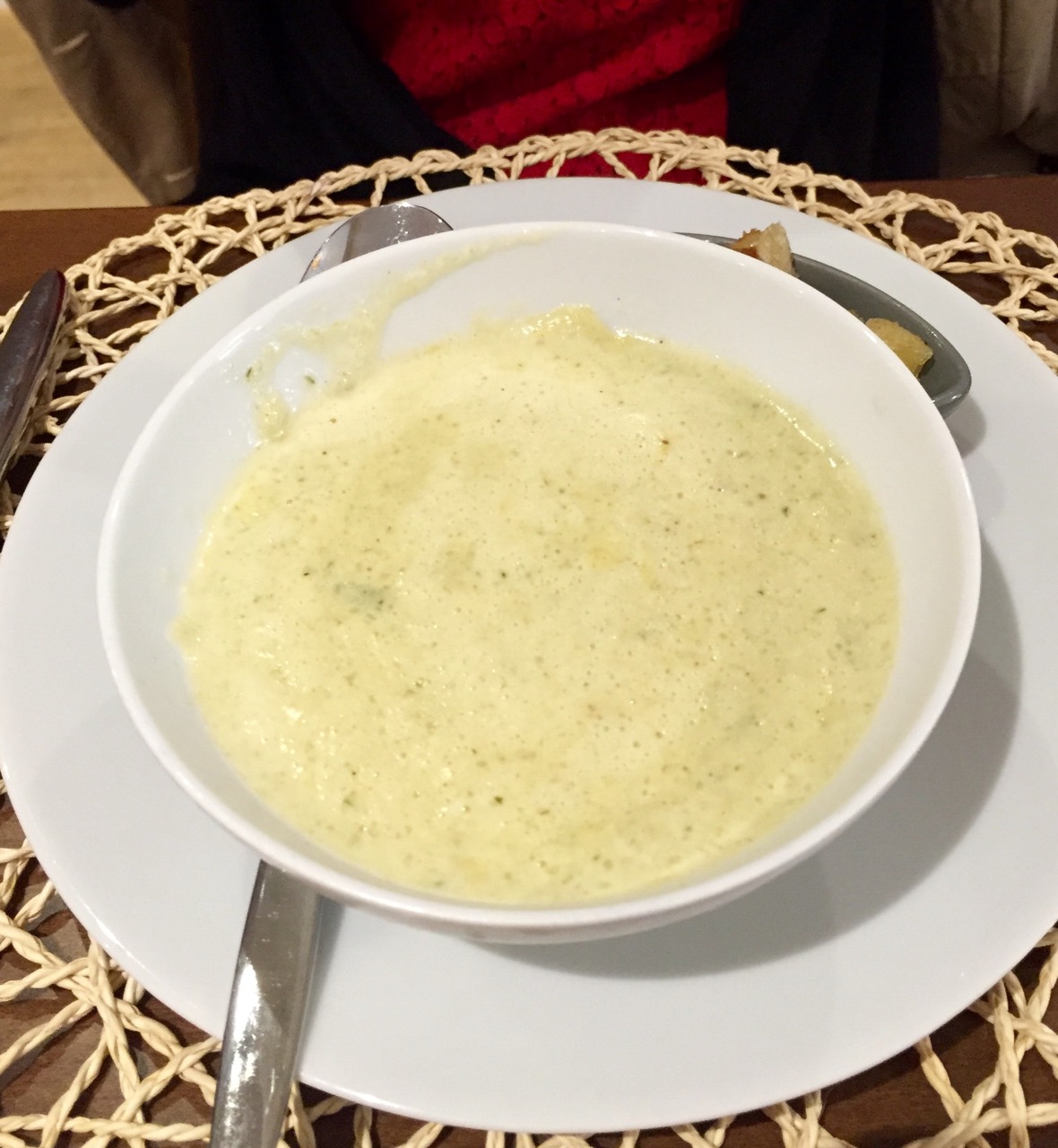 Il y a deux choix à chaque fois pour l’entrée et le plat, on part donc sur un velouté de moules servi avec des croûtons, et un chausson latino farci au jambon fromage avec salade.
