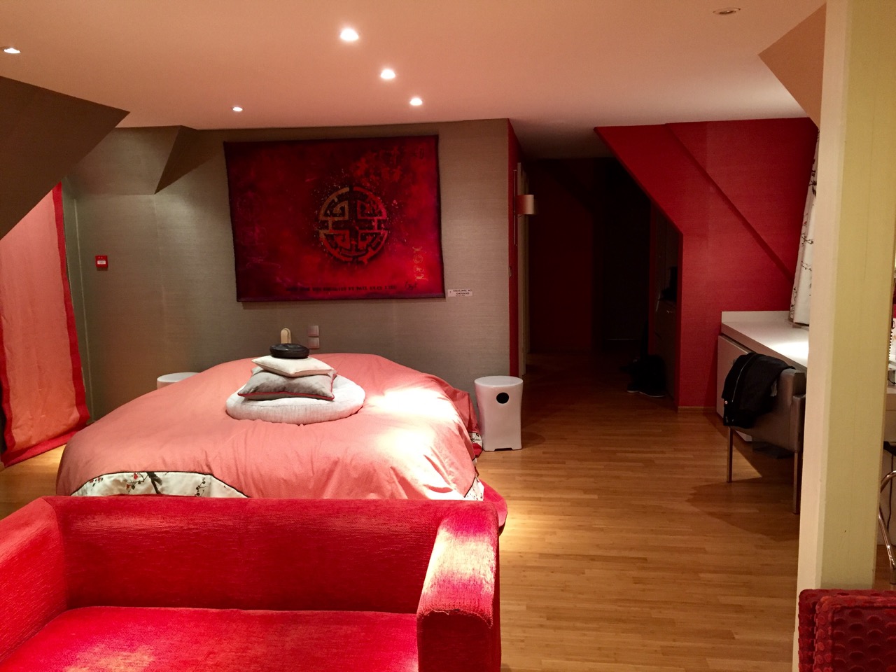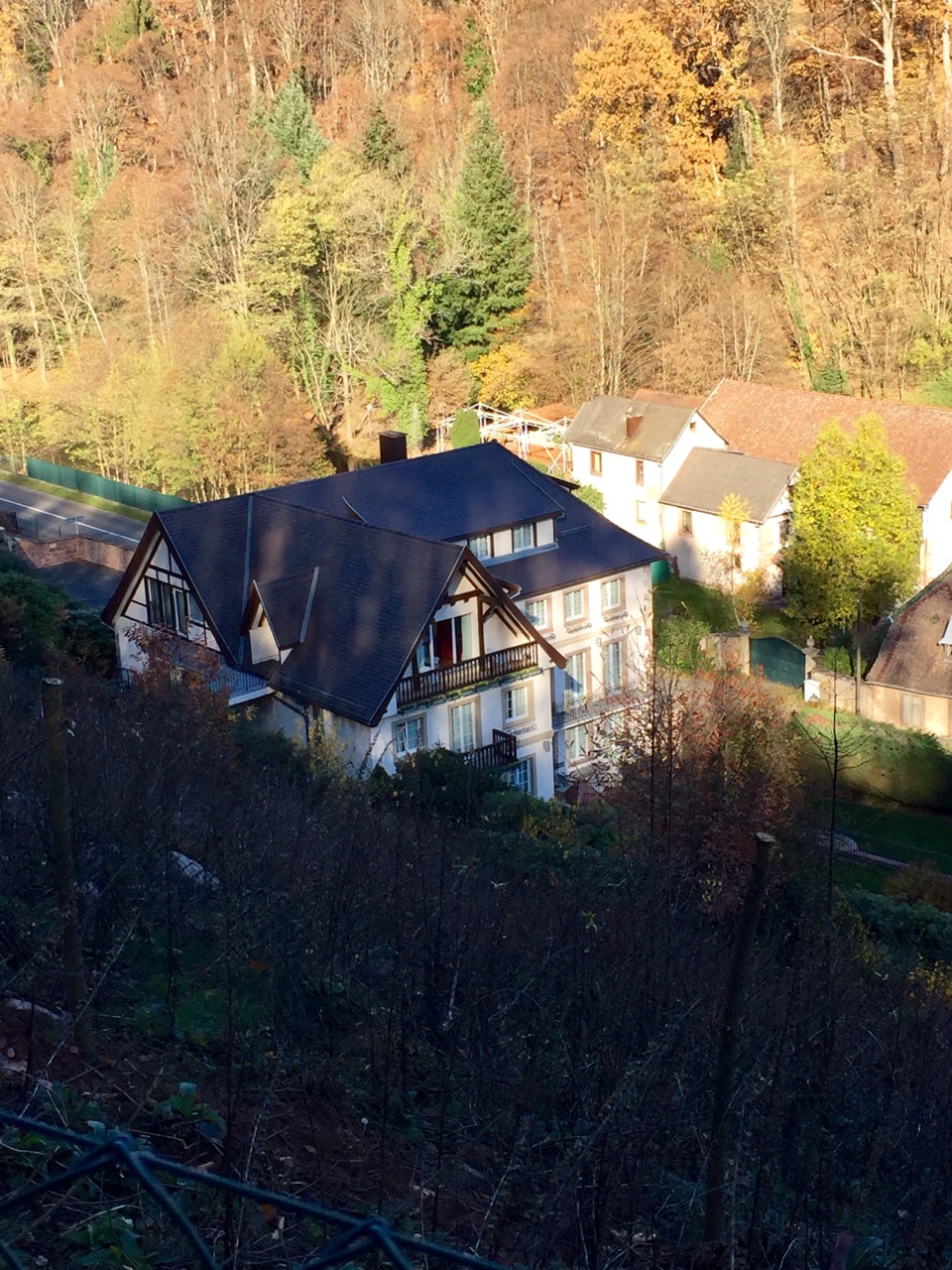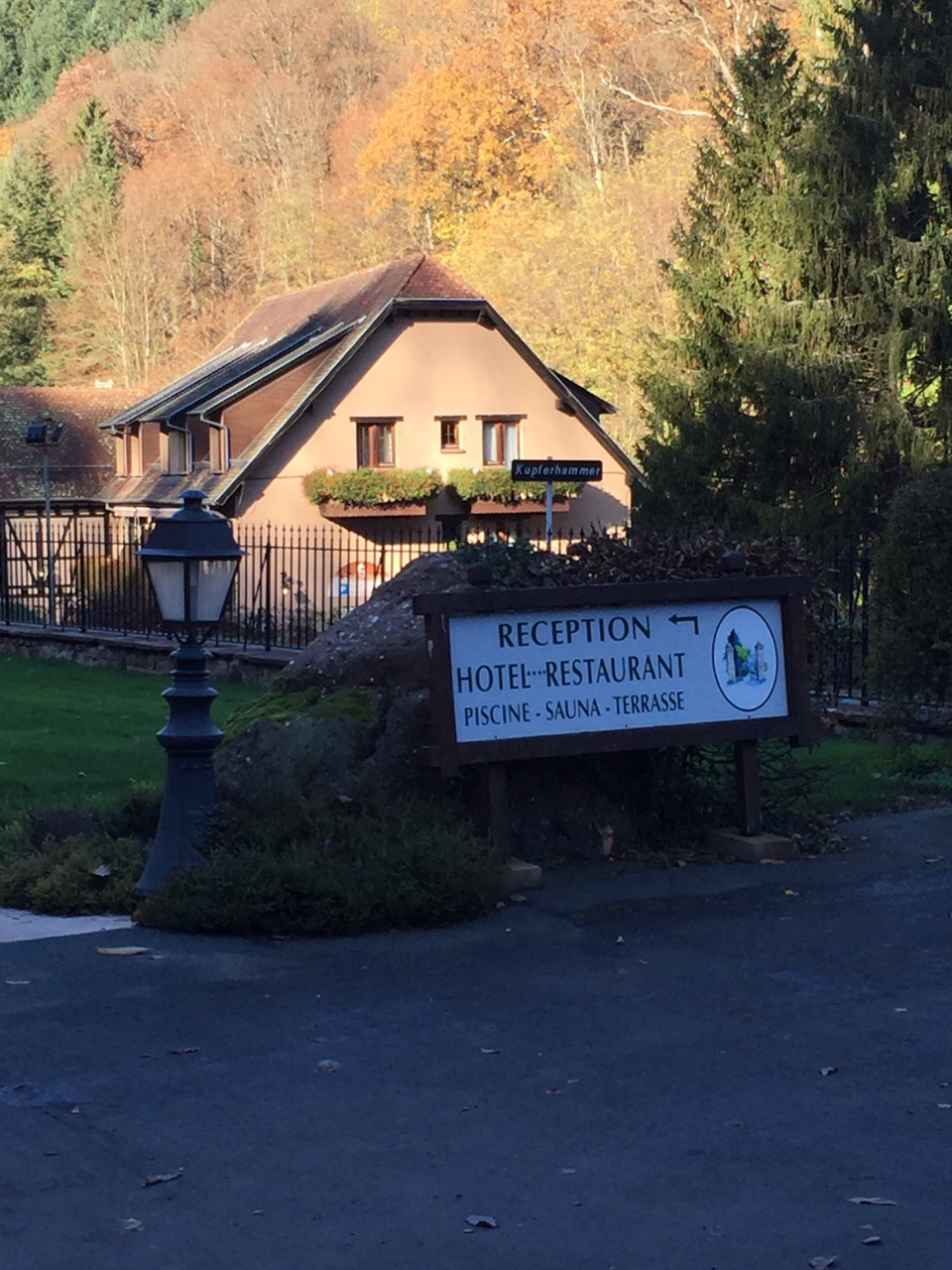 Arrivé assez tard, après la soirée James Bond SPECTRE du cinéma du Trèfle à Dorlisheim, j’étais été très bien accueilli malgré l’heure tardive. Direction, l’appartement suite de luxe : 63 m2, jolie décoration sur les notes rouges, sa salle de bain suite, et son lit rond géant ! J’ai particulièrement apprécié la douche, dont le pommeau de douche géant avec LED donnait l’impression de prendre sa douche dans une discothèque. Après une nuit longue au calme, j’ouvre les rideaux, et avec le jour je peux voir que j’avais sans doute la plus belle chambre de l’hôtel, la vue sur le cadre automnal est magnifique et apaisante.