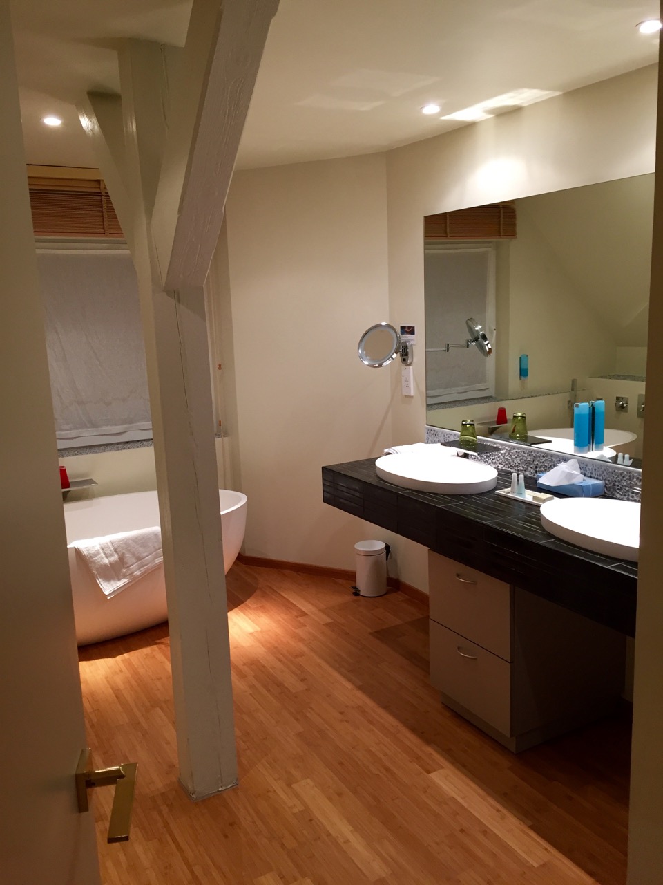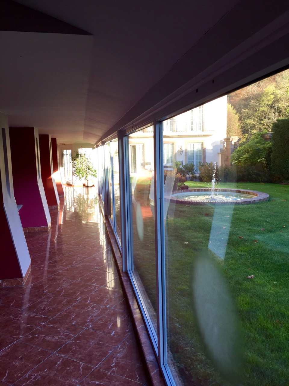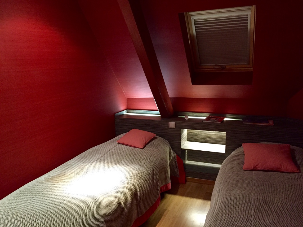 Arrivé assez tard, après la soirée James Bond SPECTRE du cinéma du Trèfle à Dorlisheim, j’étais été très bien accueilli malgré l’heure tardive. Direction, l’appartement suite de luxe : 63 m2, jolie décoration sur les notes rouges, sa salle de bain suite, et son lit rond géant ! J’ai particulièrement apprécié la douche, dont le pommeau de douche géant avec LED donnait l’impression de prendre sa douche dans une discothèque. Après une nuit longue au calme, j’ouvre les rideaux, et avec le jour je peux voir que j’avais sans doute la plus belle chambre de l’hôtel, la vue sur le cadre automnal est magnifique et apaisante.