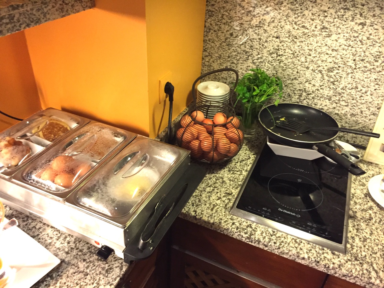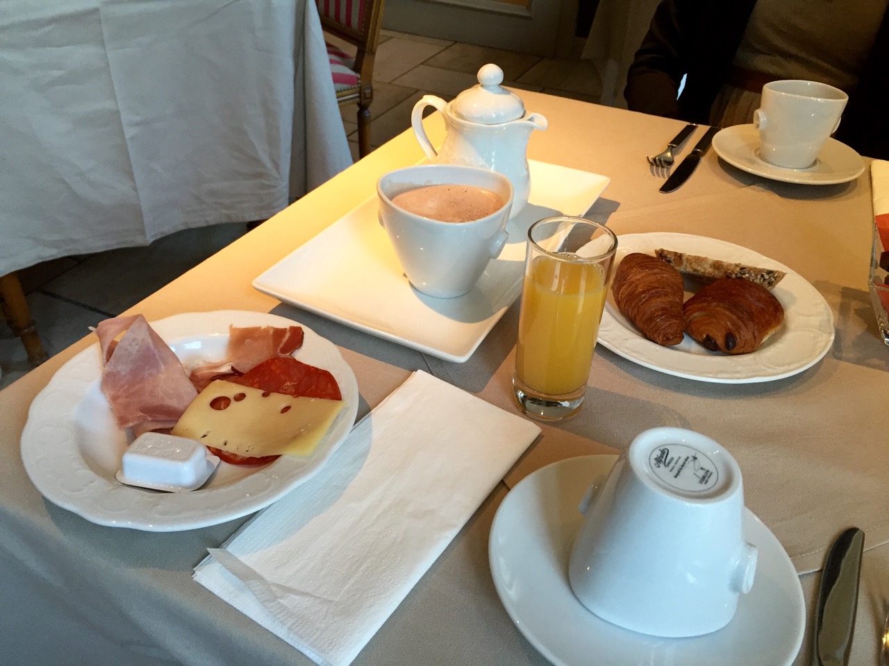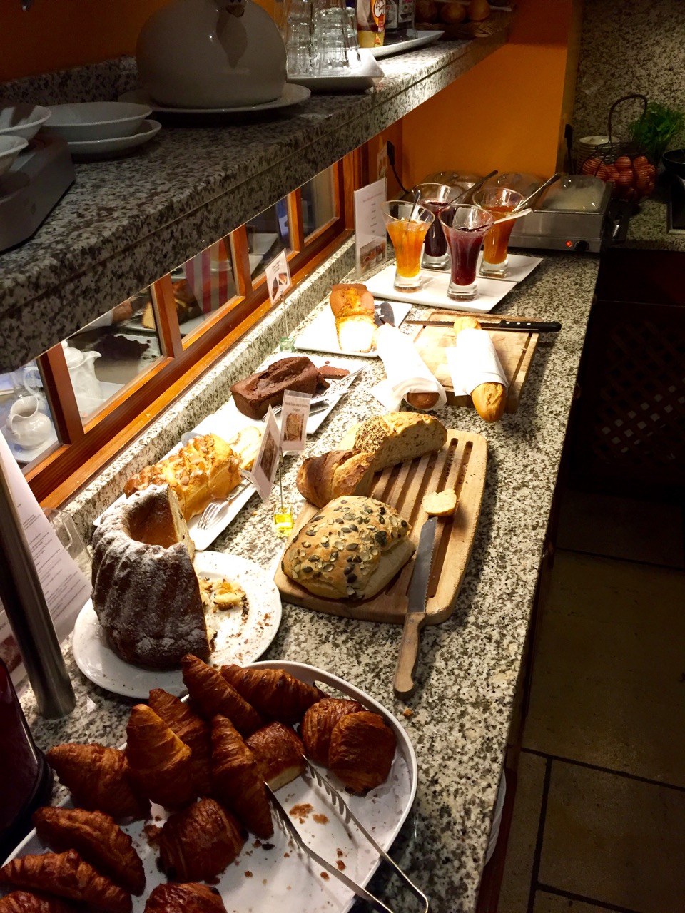 Direction le petit déjeuner, je descend les quelques étages, longe le spa, passe l’accueil, et me fait recevoir par le maître des lieux très chaleureusement. Après m’être installé à table, je prend mon temps en dégustant ce buffet classique mais efficace !