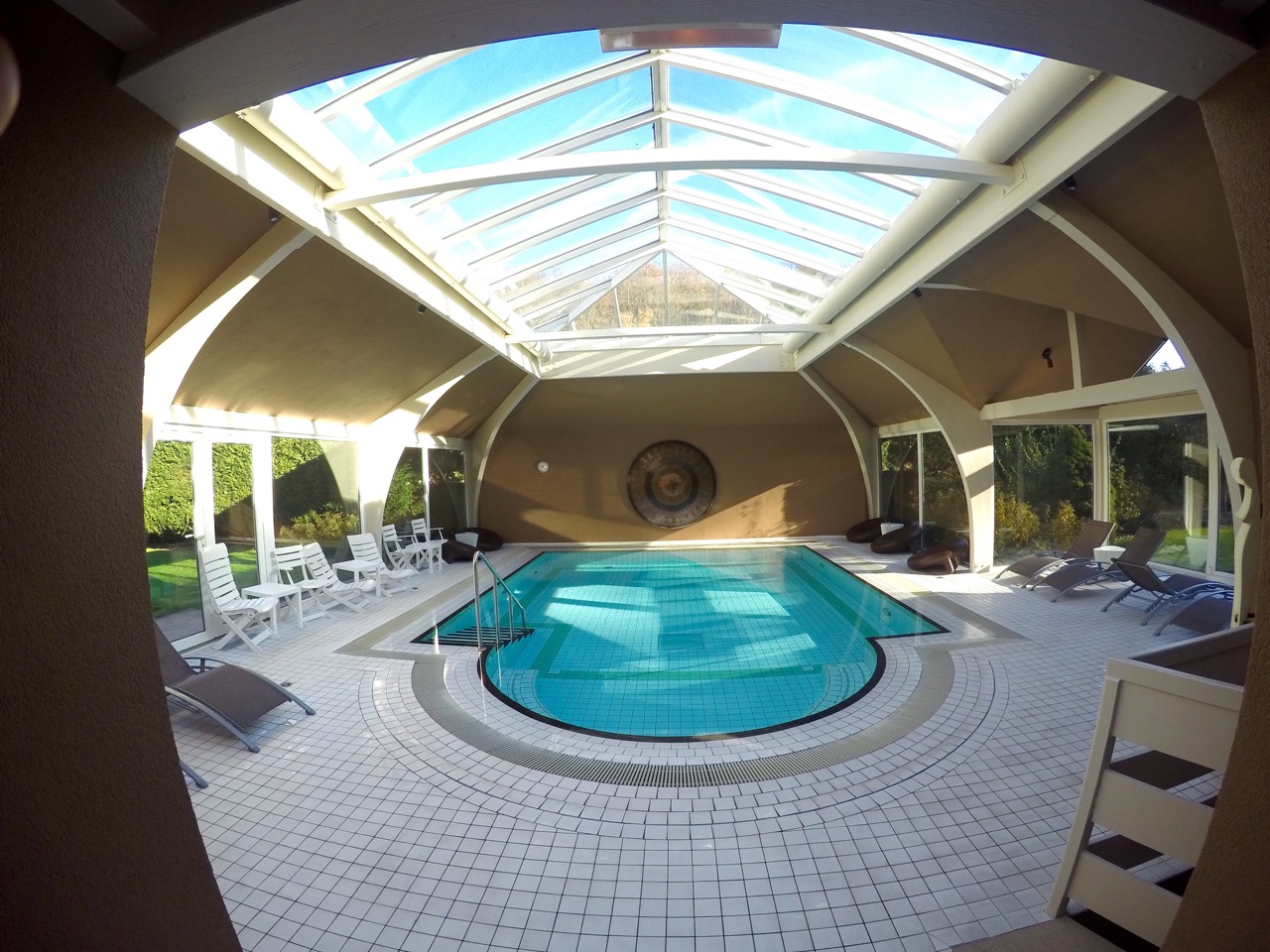 J’enchaine donc avec le spa, où j’ai bien profité de la piscine couverte sous verrière (avec buses de massage) à 29 degrés, et du petit sauna à l’étage inférieur : un vrai moment de détente avec vue sur l’extérieur.