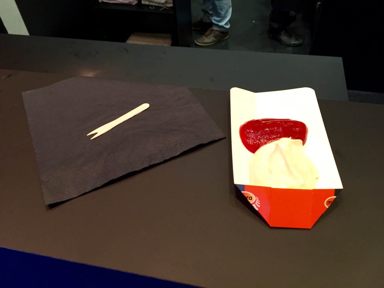 J’y suis donc allé, ce midi, jour d’ouverture, curieux et gourmand, car j’aime beaucoup la Belgique, j’ai pu y aller souvent il y a quelques années pour mon boulot. Il n’y avait pas beaucoup de monde, j’ai donc pas fait la queue, et j’ai pris une saucisse de viande hachée belge « Fricandelle », et une petite portion de frites, accompagnée d’une boisson et de Ketchup mayonnaise (elle aussi belge).