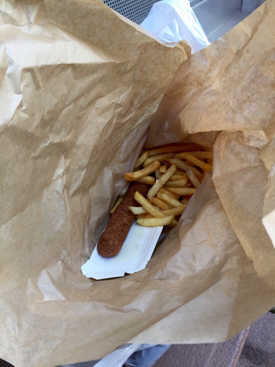 L’équipe est actuellement en rodage, mais formée par une personne qui a tenu une friterie en Belgique pendant 12 ans : assez rassurant pour le coté authentique et le savoir faire… Pour la saucisse, elle est bonne sans plus, mais j’en aurai bien mangé une deuxième ! 😉