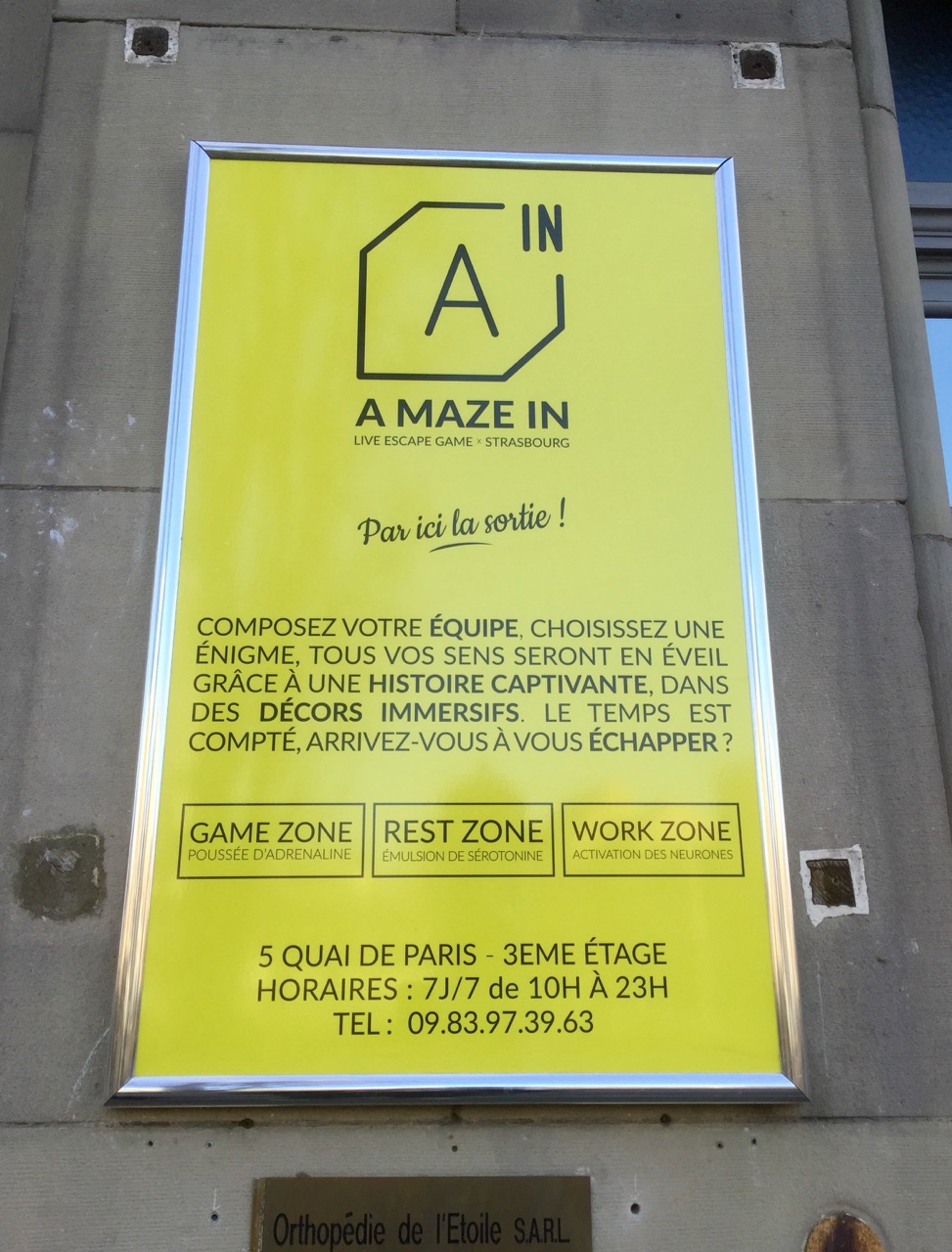 Hier matin, j’ai pu tester A MAZE IN Strasbourg, le live escape game qui a ouvert la semaine dernière dans la capitale européenne (quai de Paris en face de la Place des Halles).
