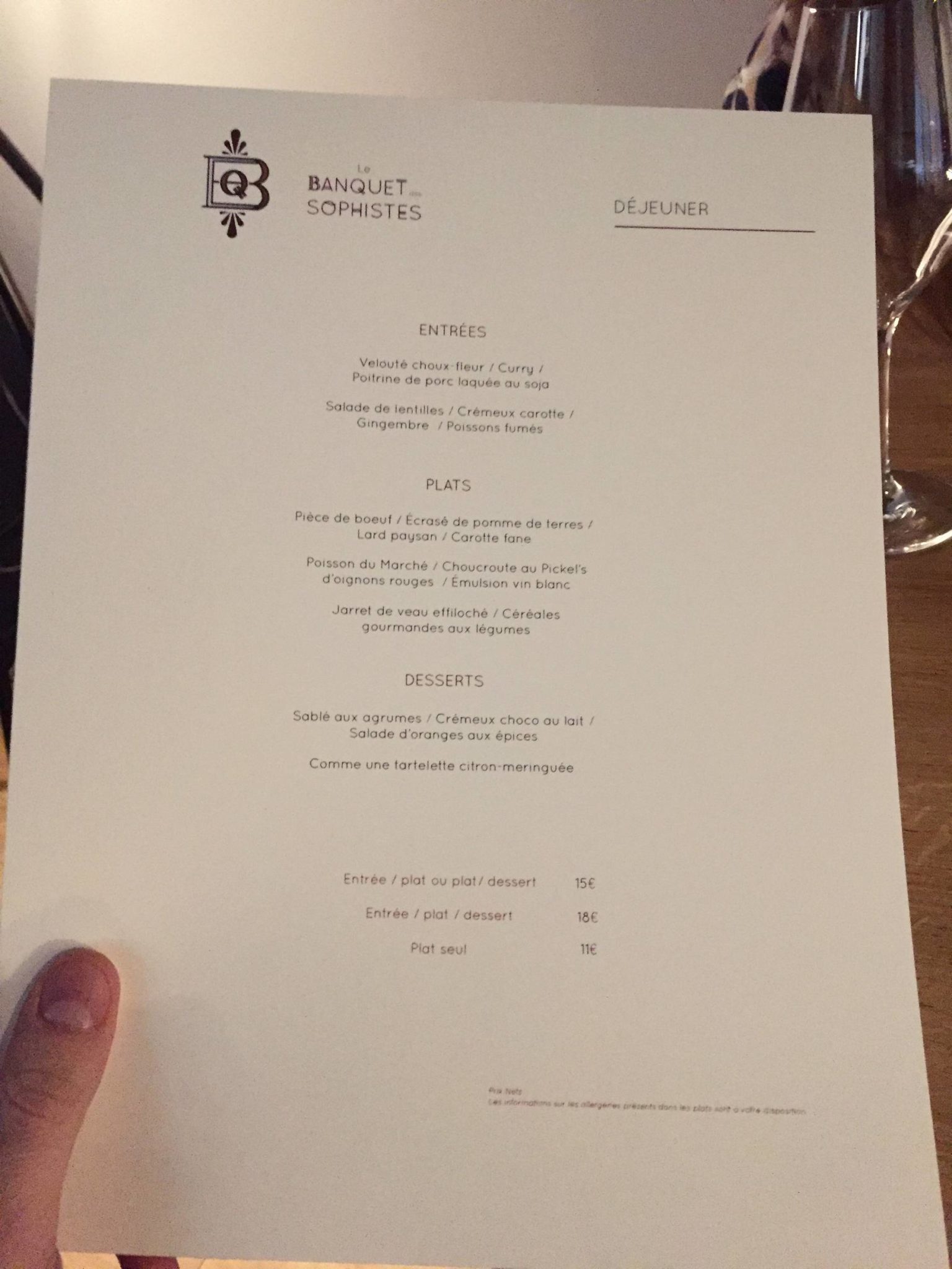 J’ai beaucoup aimé le Banquet des Sophistes. La deco est très soignée et contemporaine. La carte très alléchantes avec des produits frais. Difficile de faire un choix entre les 4 belles entrées proposées.