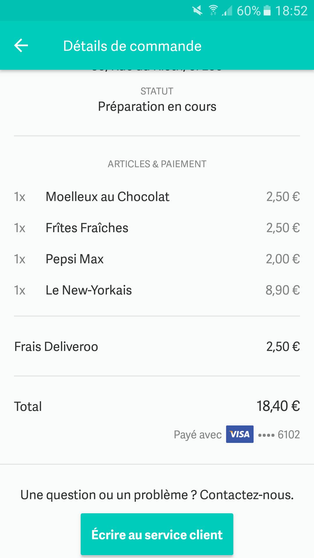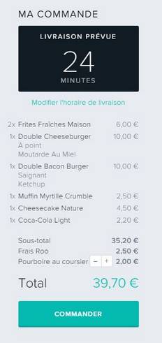 Commande passée sans soucis, l’interface web est simple (j’ai pas testé l’application), j’avais un petit soucis technique, réglé sans problème avec le chat en direct, où quelqu’un a pu répondre à ma question. On choisit facilement le resto, et on peut rajouter à sa commande les éventuelles allergènes, et on peut rajouter un petit pourboire au coursier (j’ai laissé 2€), après paiement, un petit mail de confirmation et hop, c’est parti !