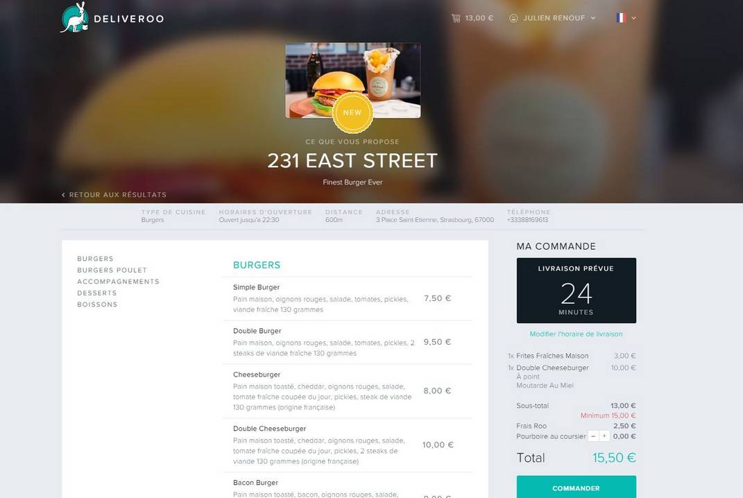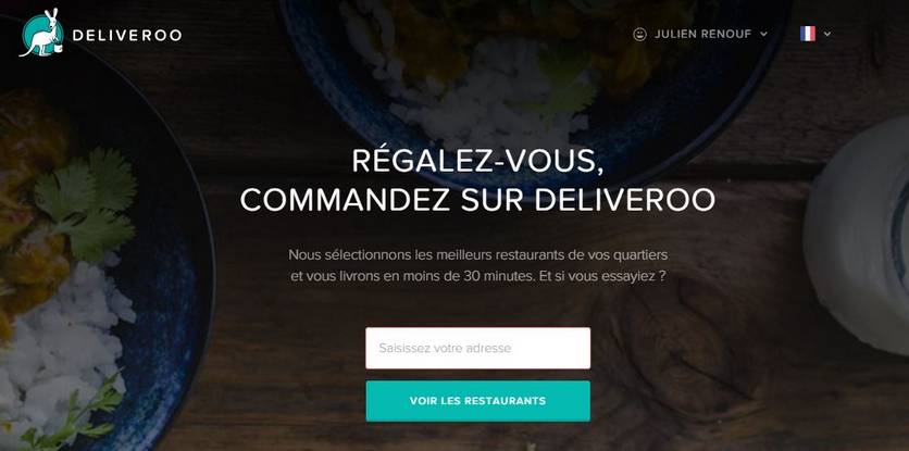 Deliveroo est une start-up anglaise arrivée en France l’année dernière, elle propose des repas livrés à domicile ou au bureau par coursiers. Le 16 février dernier, elle compte une présence dans 15 villes françaises dont Strasbourg, Paris, Lyon, Nantes… Le petit kangourou propose une mise en relation des restaurants et des usagers via son site web ou son appli, ce qui permet de commander en 30 minutes chez son restaurant préféré pour des frais de livraison de 2,5 euros 7 jours sur 7 et de 11h à 23h. Ces livraisons se font via des coursiers (souvent à vélo) autoentrepreneurs (à la mode Uber en gros).