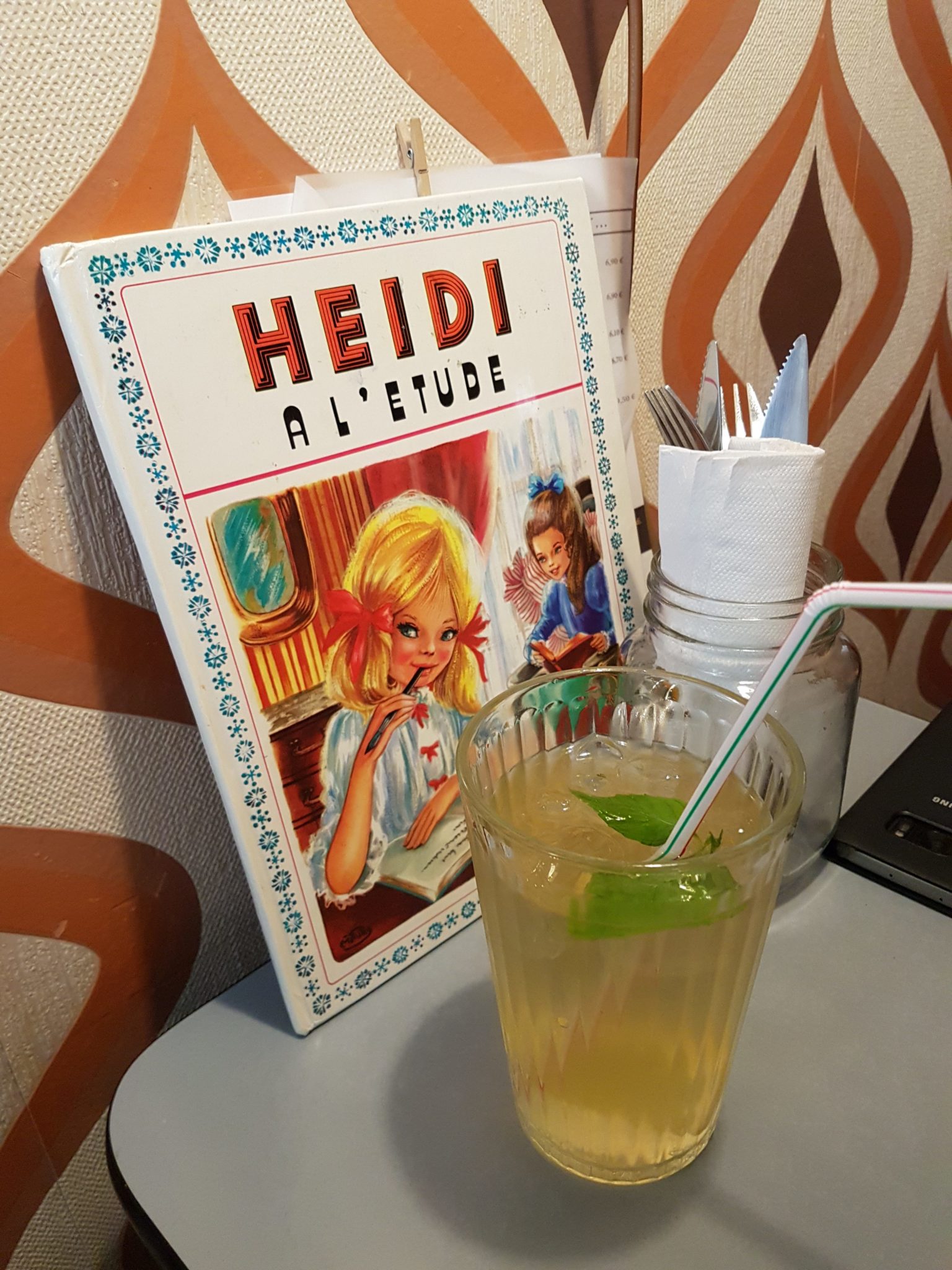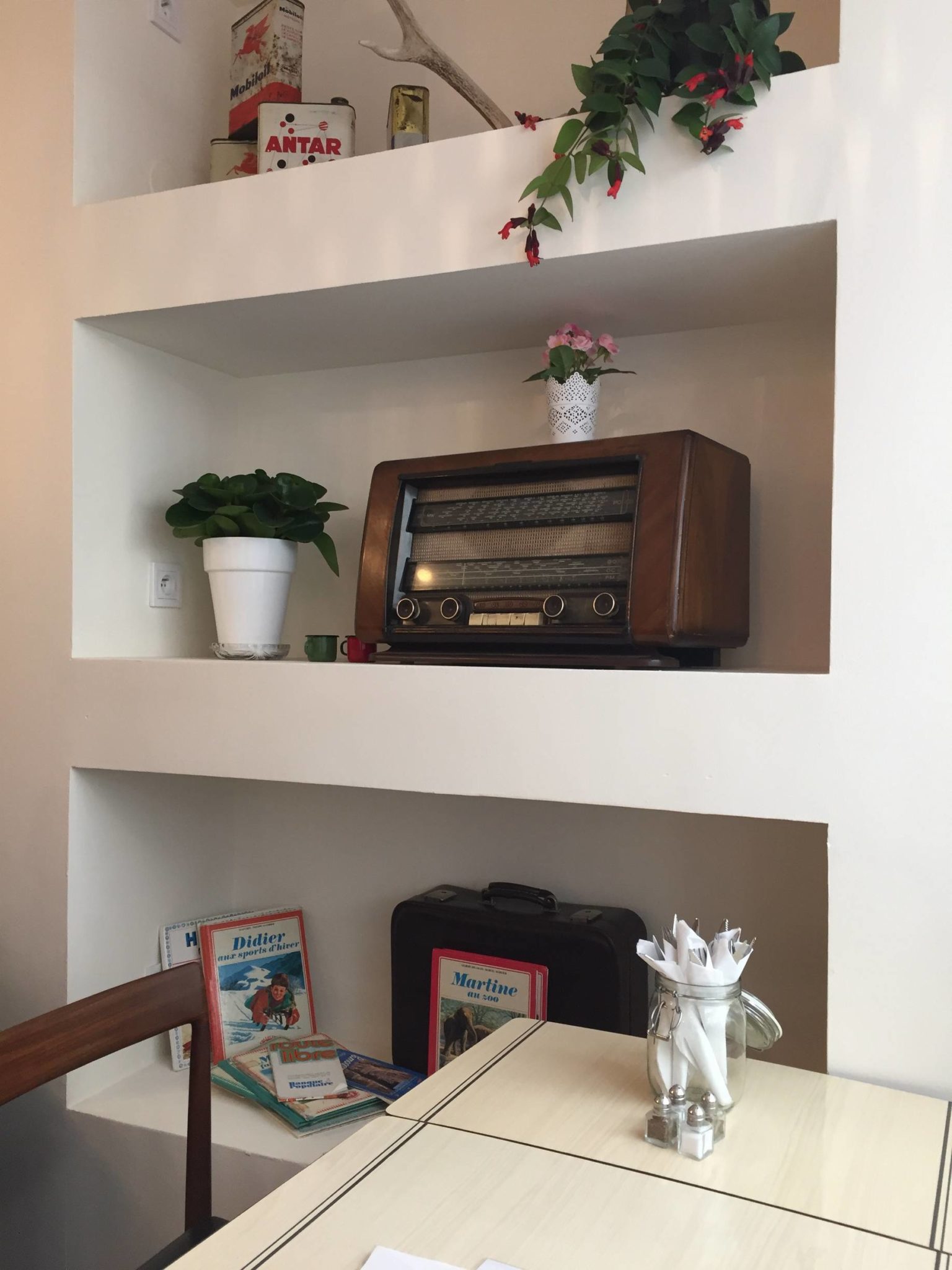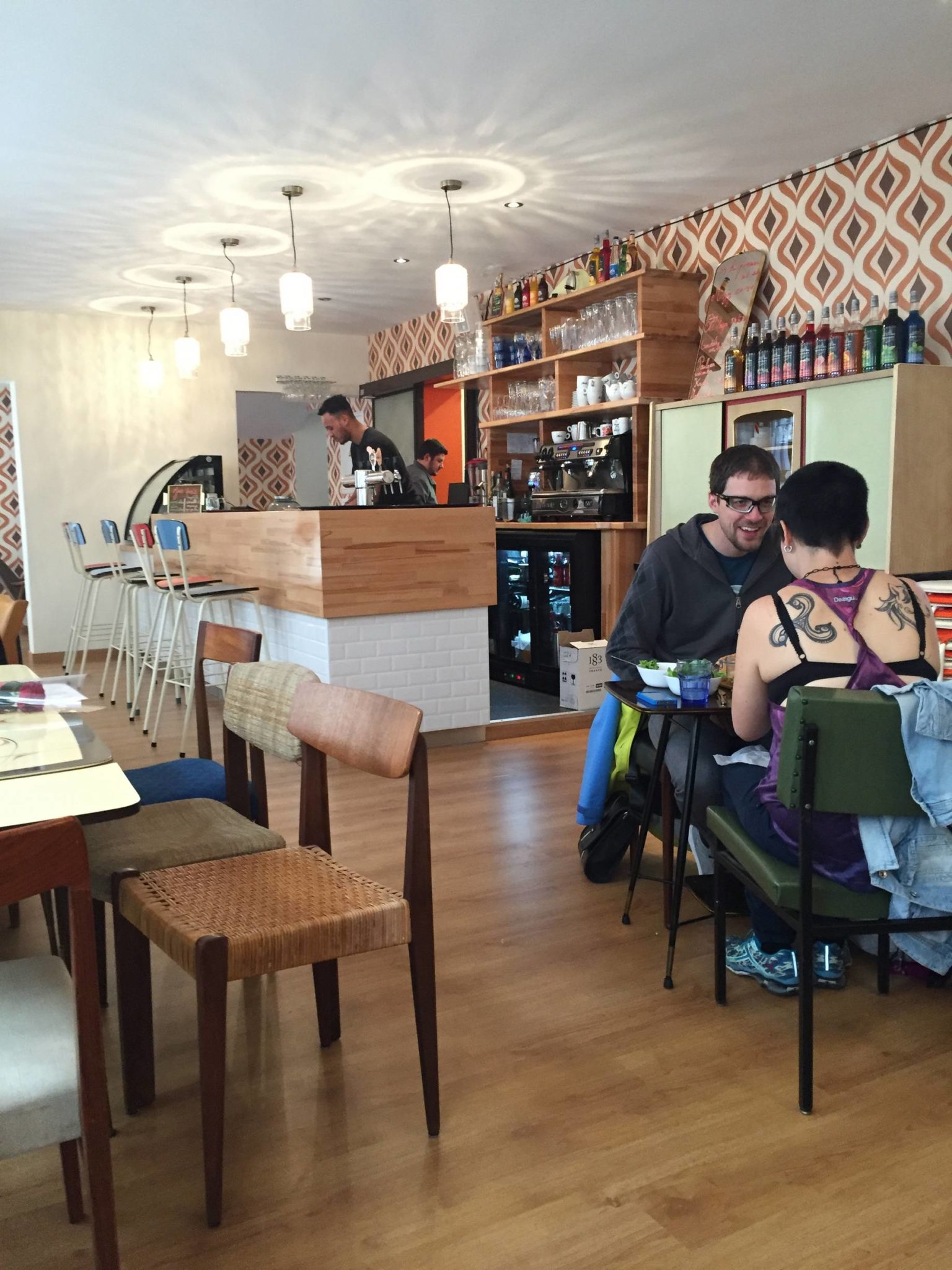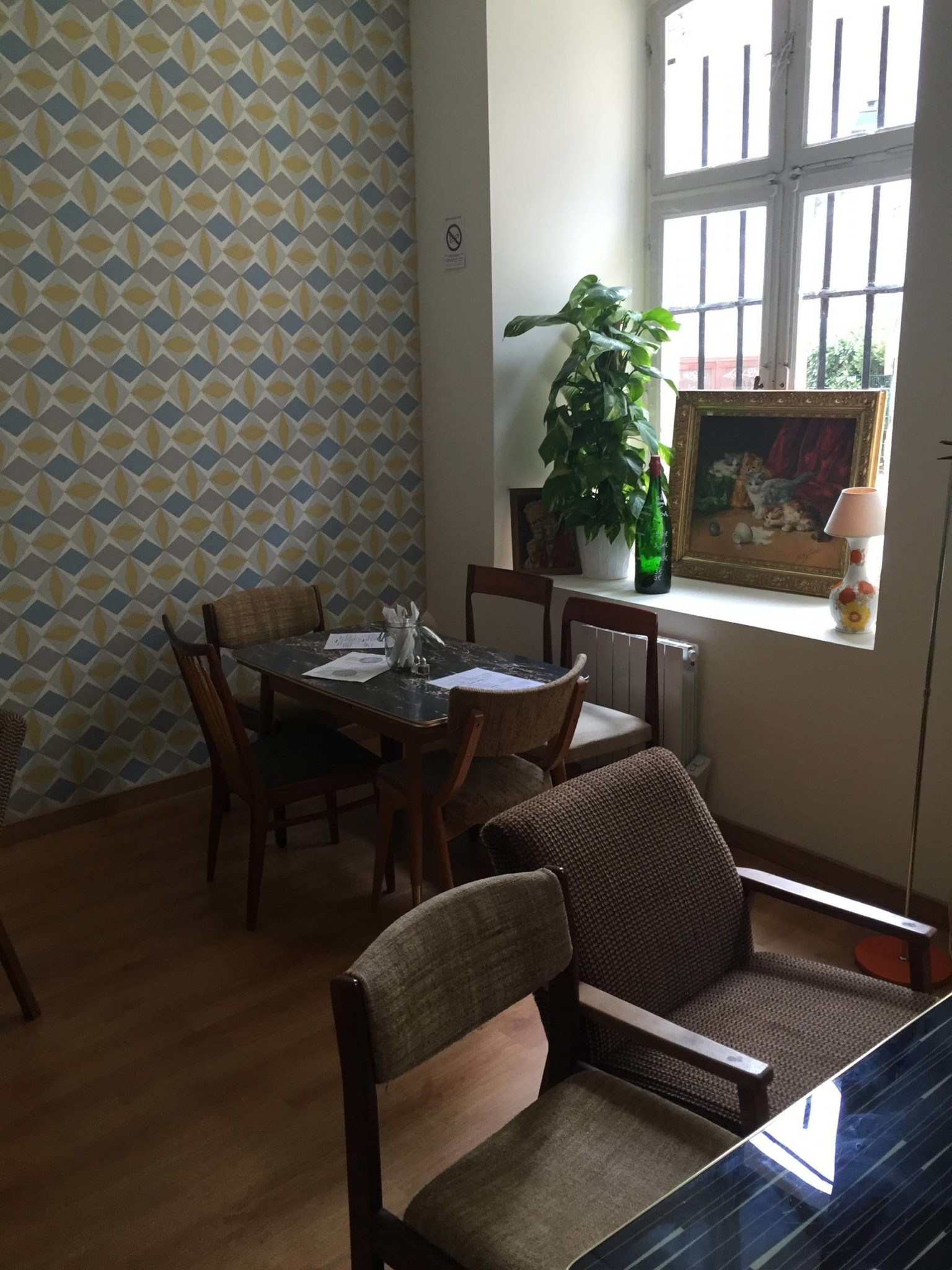 Ouvert depuis le 13 avril 18h, j’y suis allé le lendemain midi pour y manger : autant vous dire que je pensais être seul mais ça n’a pas été le cas, restaurant quasi plein pour le premier midi, preuve que la pub qui précédait sur les réseaux sociaux avait bien fonctionné. Niveau ambiance, on est clairement dans les années 70, bien travaillée, assez cosy d’ailleurs dans la mouvance de ce qu’il se fait à l’heure actuelle dans les nouveaux bars & restos en France (ça m’a fait penser un peu au Kitsch’n Bar, en moins bordélique ! 😉 )