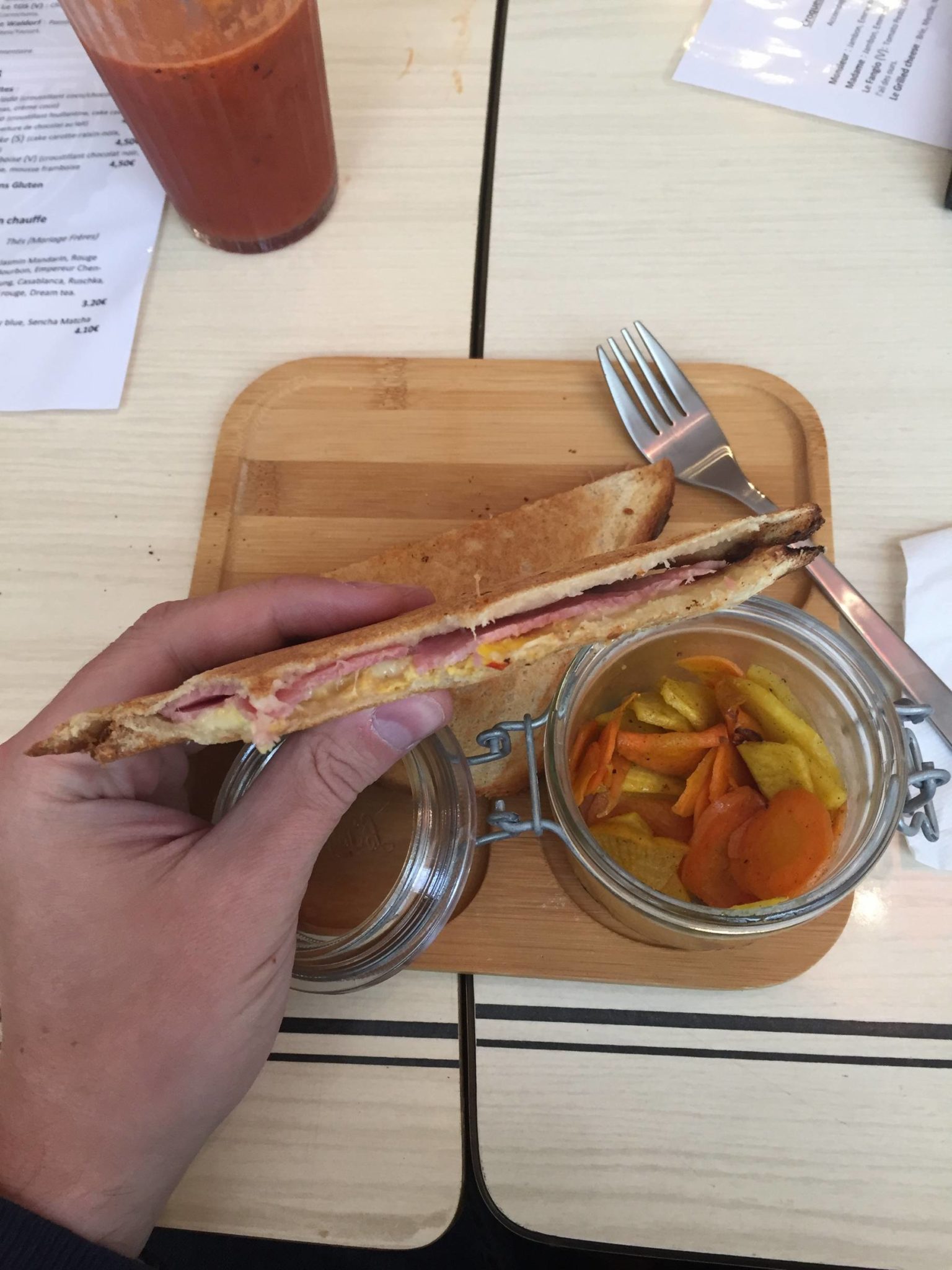 Je m’installe, un gentille serveuse me propose à boire, je pars sur le jus de fruits fait maison (carottes, myrtille, gingembre si je me souviens bien?) plutôt bon, assez copieux. Et pour manger un Croque Madame, servis avec des légumes rôtis et salade : sans plus, je pense sans vouloir me vanter que ceux que je fais à la maison sont meilleurs 😉 ; celui ci était simple sec, et avec trop de pain. Les légumes rôtis étaient pas assez cuits mais bien assaisonnés et quant à la salade, je l’attends toujours car on me l’a jamais apporté ! (Je ne l’ai pas réclamé car j’avais plus trop faim…) Bref, les hot-dogs me semblaient meilleurs…