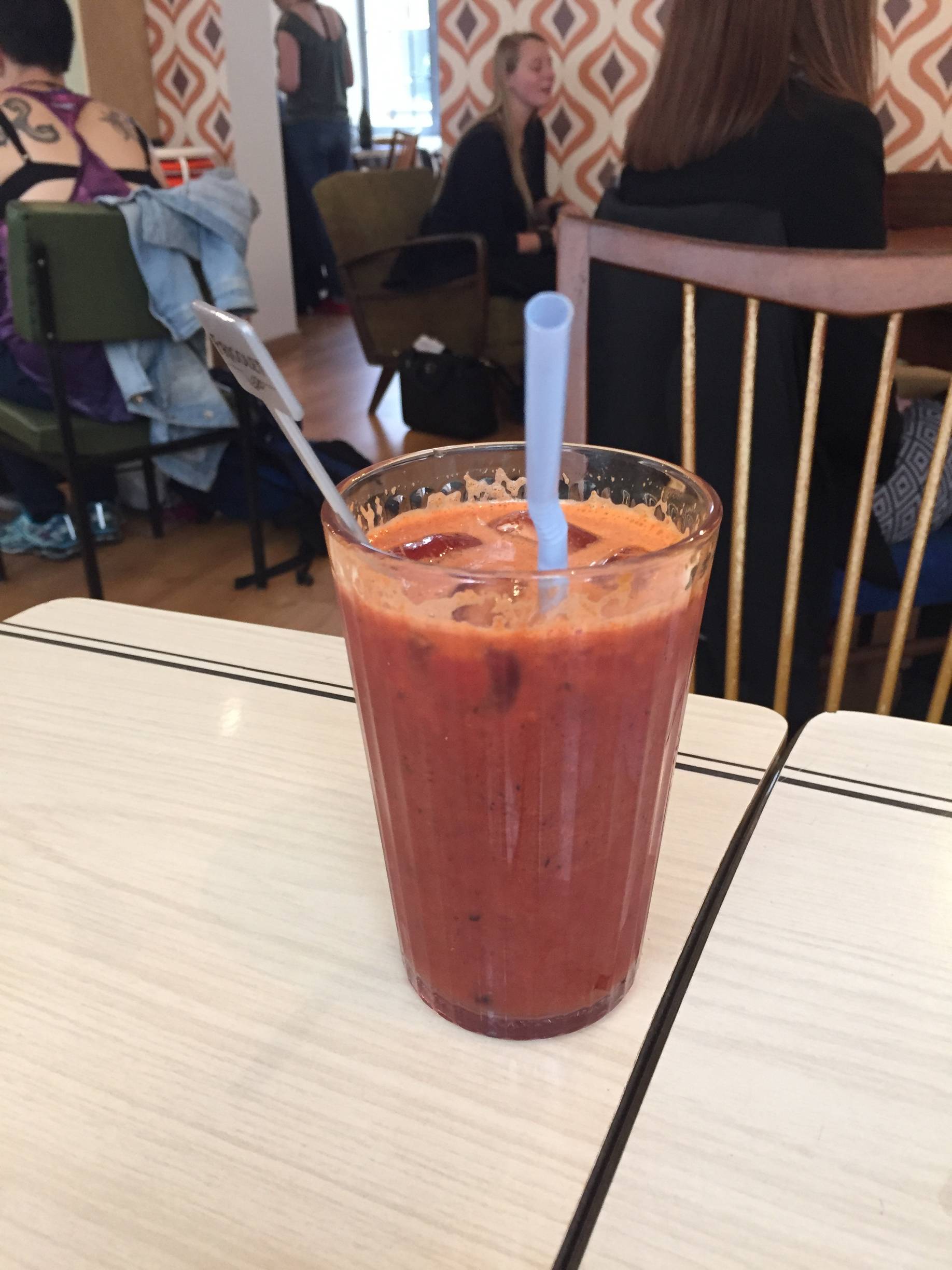 Mise à jour du 11/05/2017 : J’ai mangé seul dans l’arrière salle, c’était calme, sympa et servi rapidement. Le thé glacé était correct, sans plus. Mon hotdog vegan avec guacamole et tomate plutôt bon mais impossible à manger proprement sans en mettre partout, car ça déborde de tous les cotés et pas moyen de le couper sur la minuscule planchette qui sert d’assiette, à revoir. Quant aux pates au parmesan, bonnes mais un peu grasses. Avis plutôt positif ce coup-ci, j’avais plus faim pour un dessert !