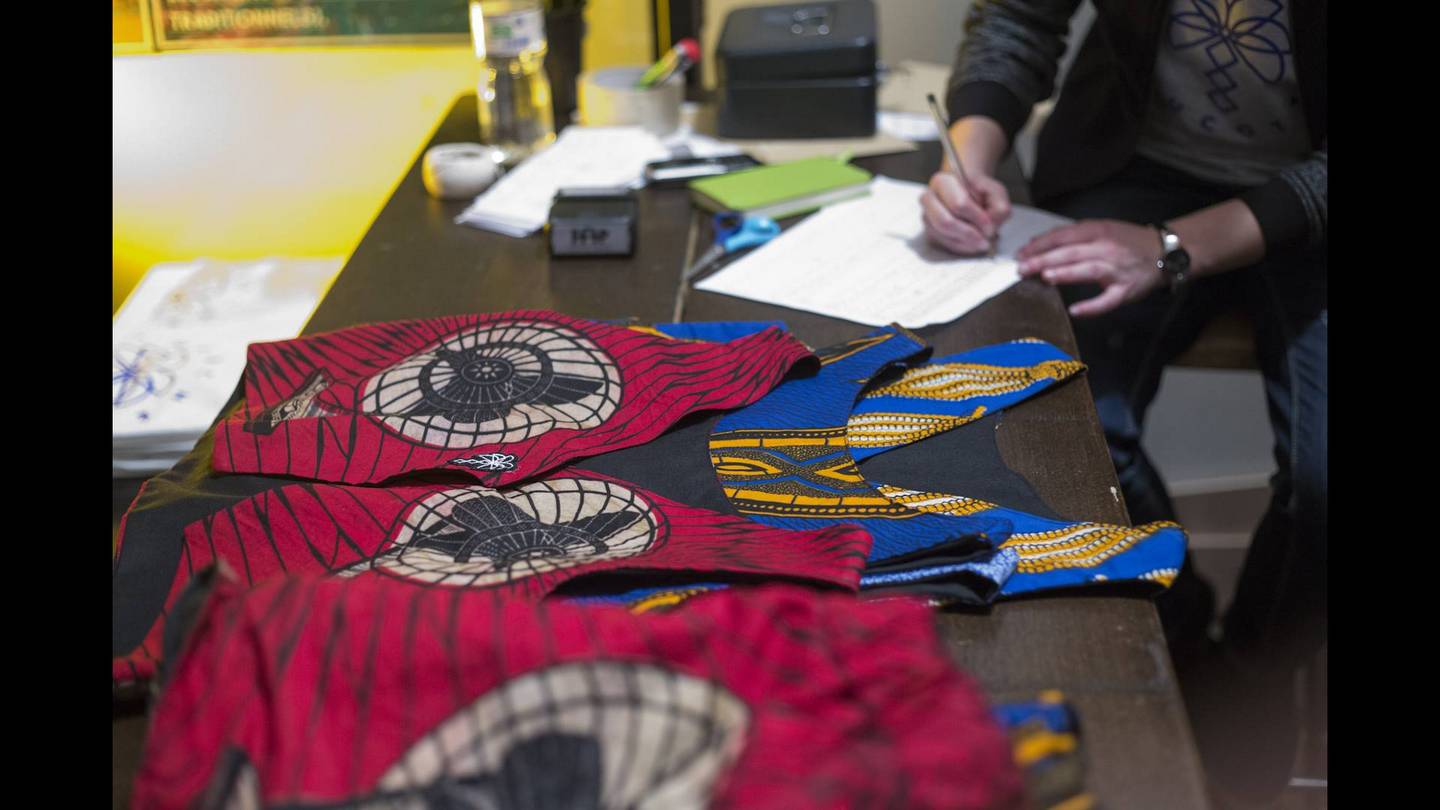 Réversibles, les créations Marché Boucotte présentent un côté coloré, en wax, et un verso plus sobre, en coton des uniformes scolaires ou en bazin, tissu traditionnel de fête.