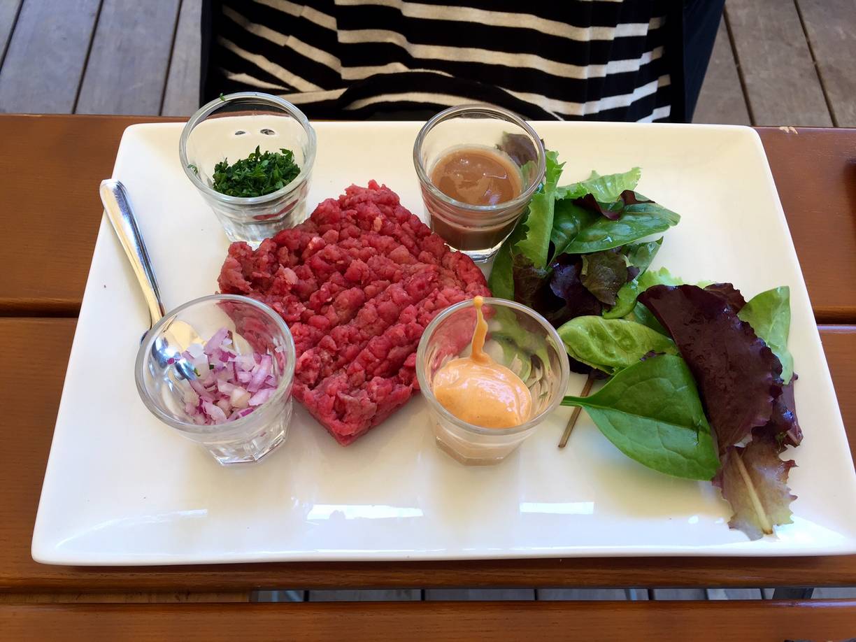 Réservé un beau samedi soir en terrasse à 20H15 pour deux, on a bu deux bières de la maison, une planchette de charcuterie à partager et un plat chacun : Steak tartare épicé et un mix de grillades au canard. Les plats étaient très bons, avec des produits de qualité, juste la purée était remplie de beurre mais on a bien mangé. Le seul hic, c’est la durée du service : très très lent… Trop de monde commandait en même temps, dommage sinon c’était parfait. Addition pour le tout : 61 euros.