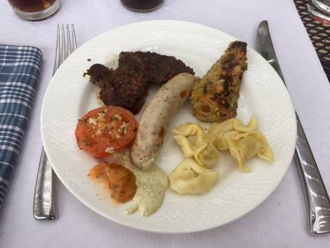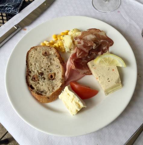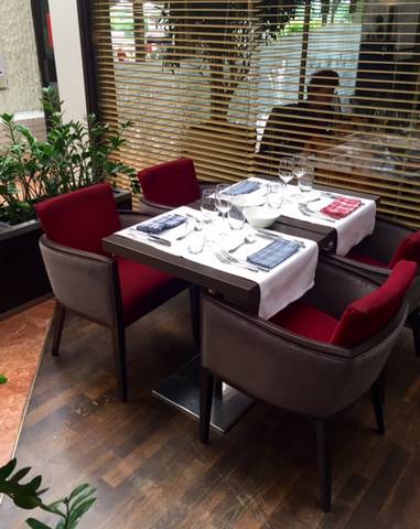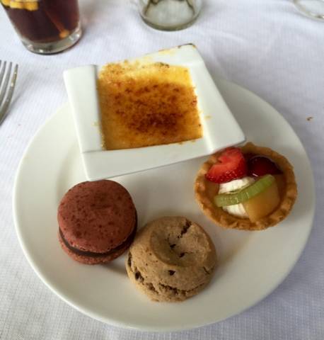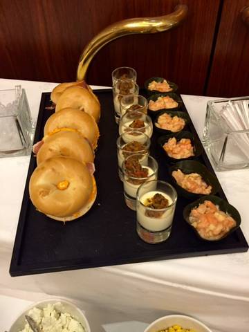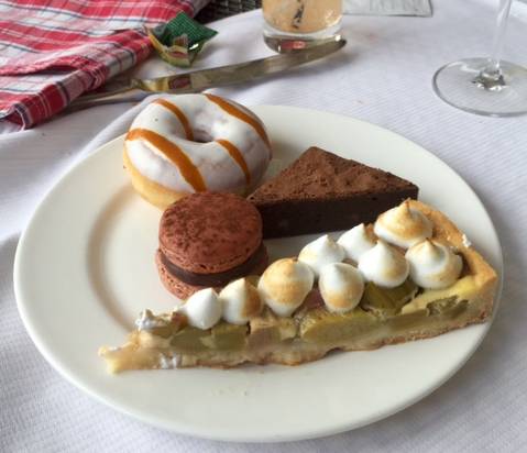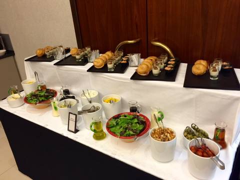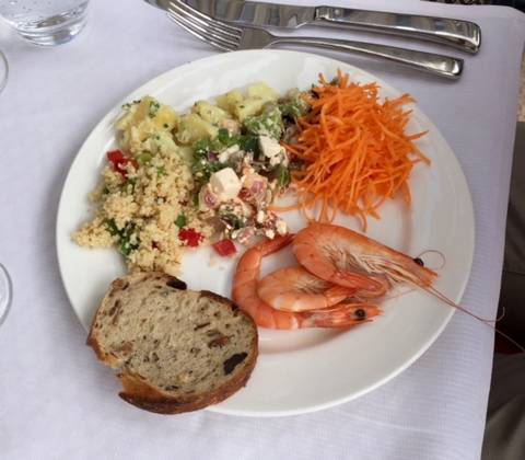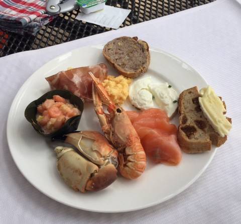 Arrivés à 11h30 et malgré un temps changeant toutes les 5 minutes; on s’est installés en terrasse (couverte mais qui s’escamote au premier rayon de soleil) sur une grande table pour être à l’aise : un vrai avant-goût des vacances ! Après un accueil avec une coupe de champagne, on fait le tour des buffets à l’intérieur pour savoir par où commencer (et surtout ne pas se remplir le ventre de pain ou de petites pâtisseries alors que des mets raffinés nous attendent pour la suite.)