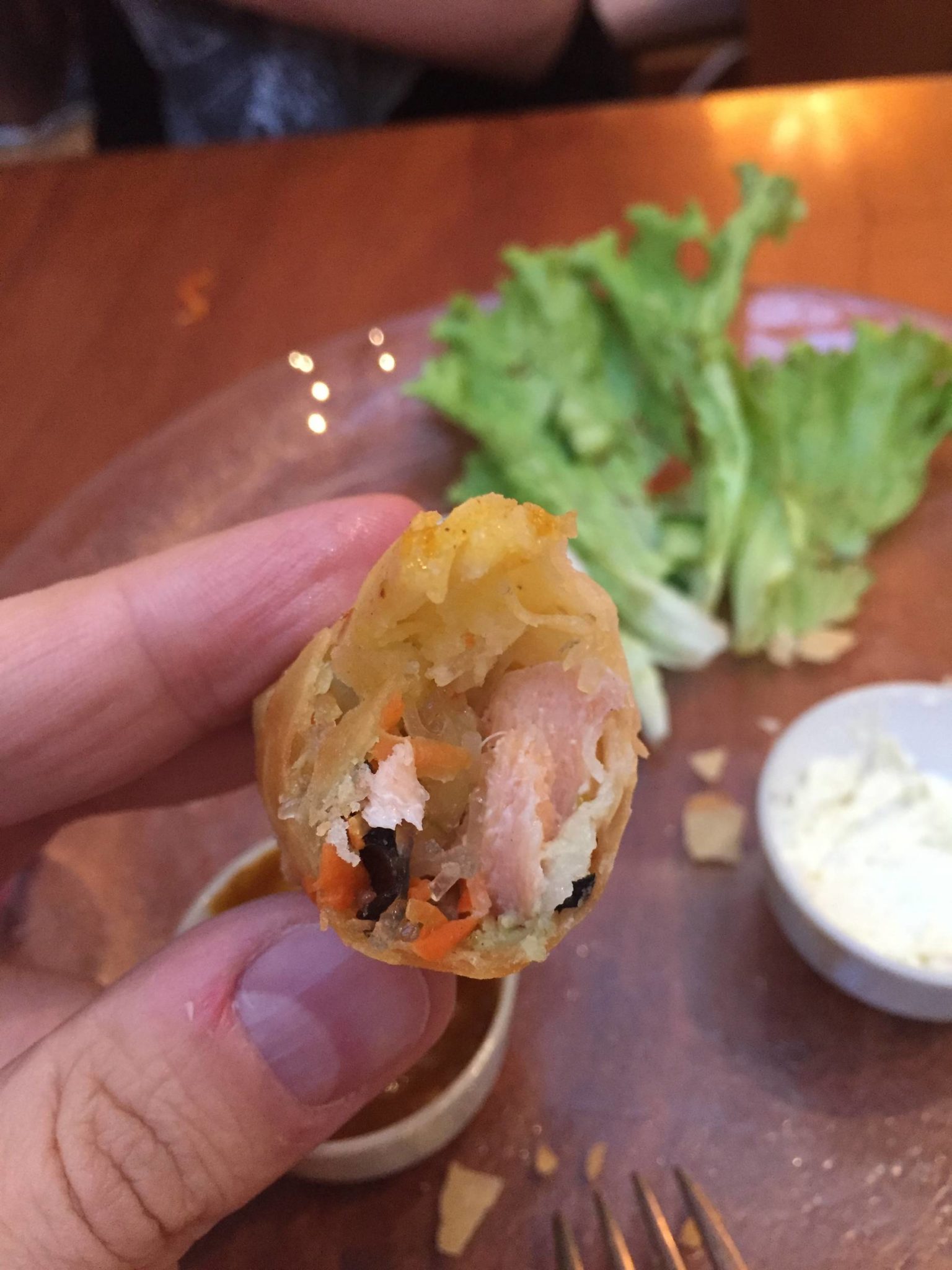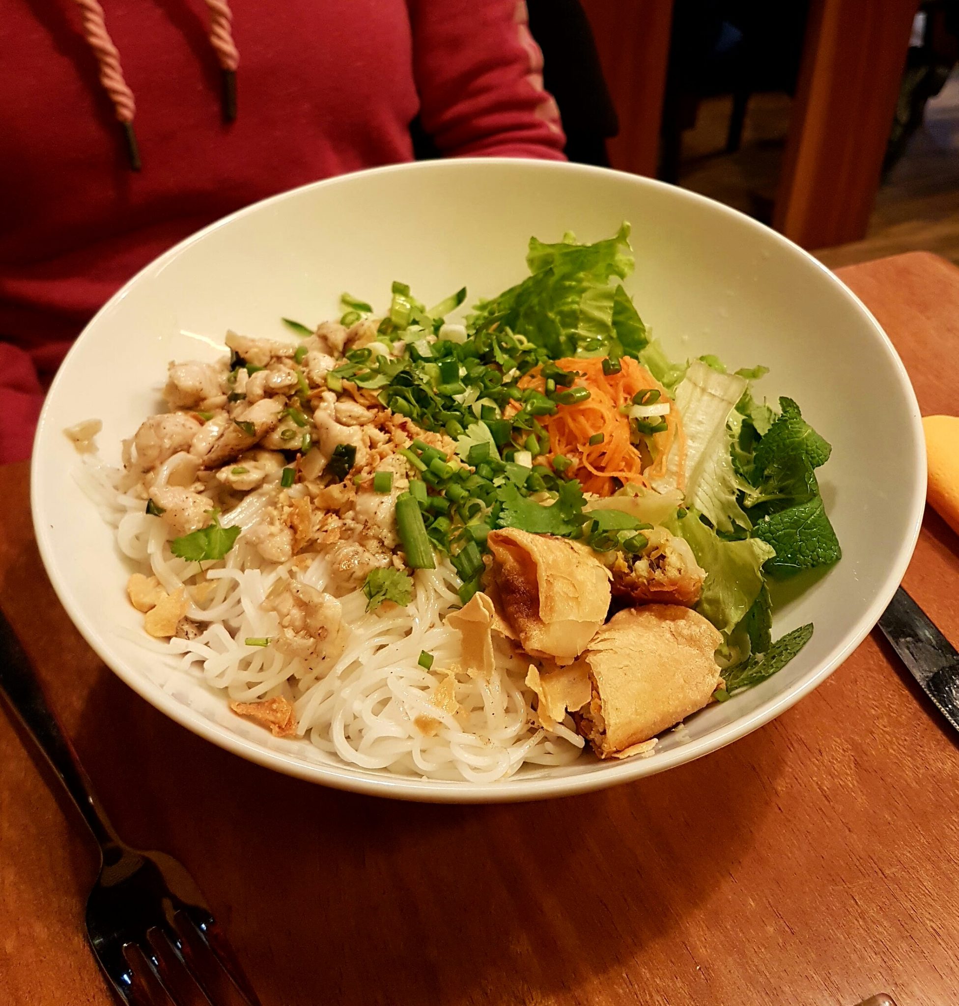 J’ai retenté l’endroit à l’occasion du Refugee Food Festival à Strasbourg, j’ai pu gouté un excellent morceau de poulet avec un riz afghan relevé, mais je dois dire que le reste du menu était bof : pour la personne qui m’accompagnait un BO BUN au poulet fade, et pour moi dans le cadre de la formule du jour : un rouleau de printemps à la saucisse alsacienne et emmental pas terrible et un pain perdu à la mangue un peu bâclé (non pris en photo). Donc pour moi ça ne s’améliore pas, à part l’accueil : nous avons eu une serveuse charmante et souriante !