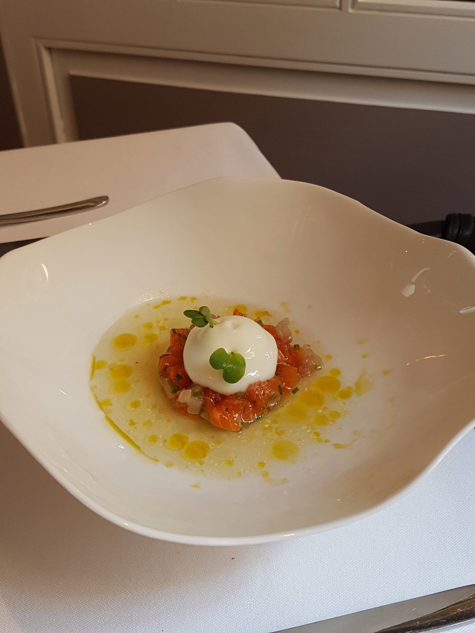 Je suis passé cette semaine, un midi, pour voir ce que valait cette cuisine de “saltimbanques”… Je dois avouer que c’est un quartier où je ne vais pas souvent car c’est souvent un peu galère de se garer dans le coin, j’ai donc opté pour le vélo. Réservé pour 12h15, la salle était vide mais c’est vite remplie de personnes qui venait manger la formule du jour. La salle est très belle, claire, décorée avec soin, avec des fauteuils confortables le tout dans une ambiance assez calme. On est tous partis sur cette formule entrée, plat, dessert à 23 euros par personne (ou entrée/ plat ou plat / dessert pour 19 euros.)