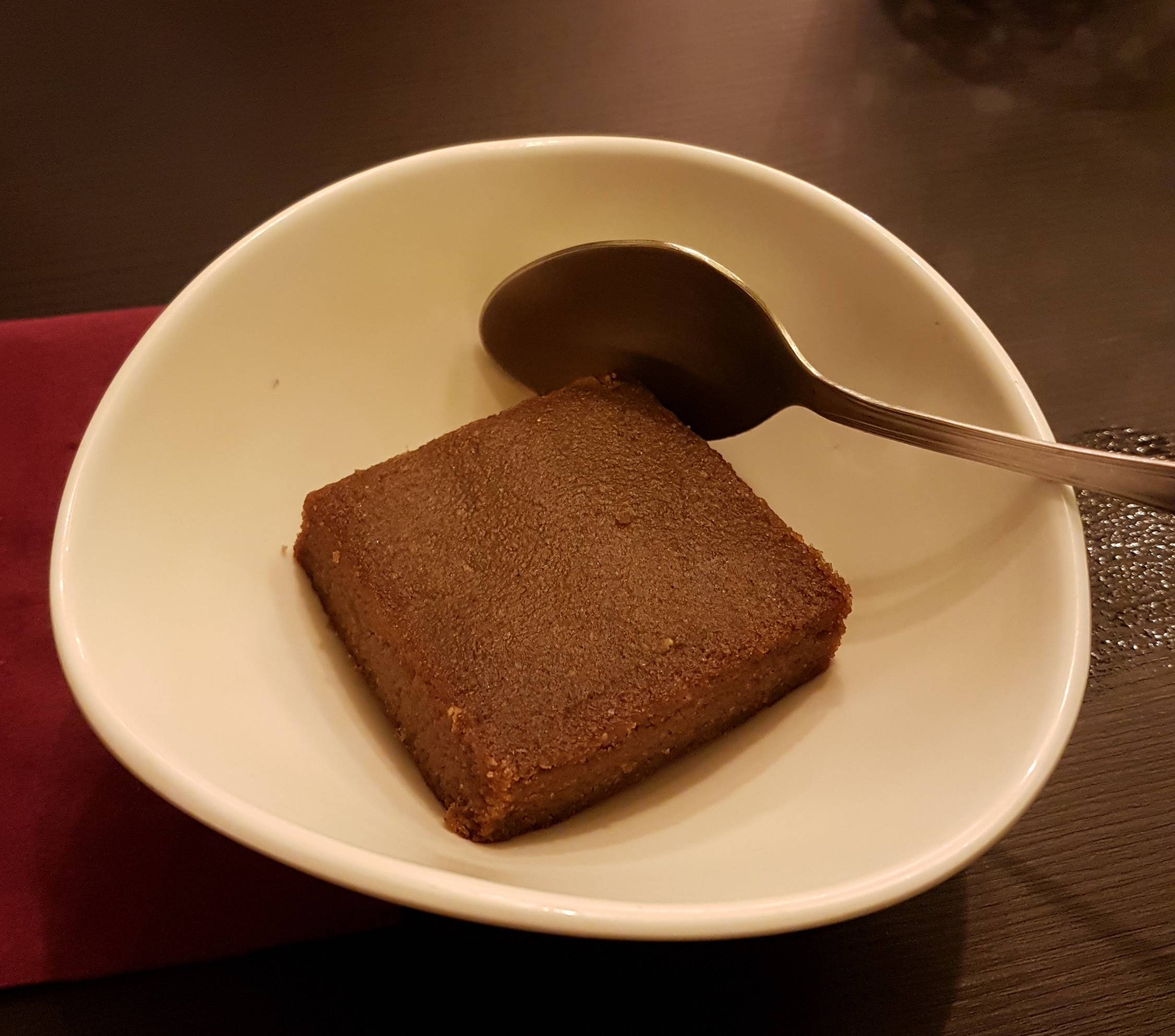 Les momos se commandent par 7, et vous avez le choix entre bœuf oignon gingembre ou porc céleri gingembre ou encore épinard fromage ail gingembre… Le tout accompagné d’une petite sauce relevée et une petite salade. J’ai tout goûté, avec les différents mode de cuissons, et j’ai tout aimé. C’était original mais très bon. 7 raviolis par personne sont largement suffisants. Accompagné d’un jus de lychee avec des graines de basilic, c’est passé parfaitement ! Le dessert TSEM PA était plus surprenant, un peu sec, difficile à décrire…