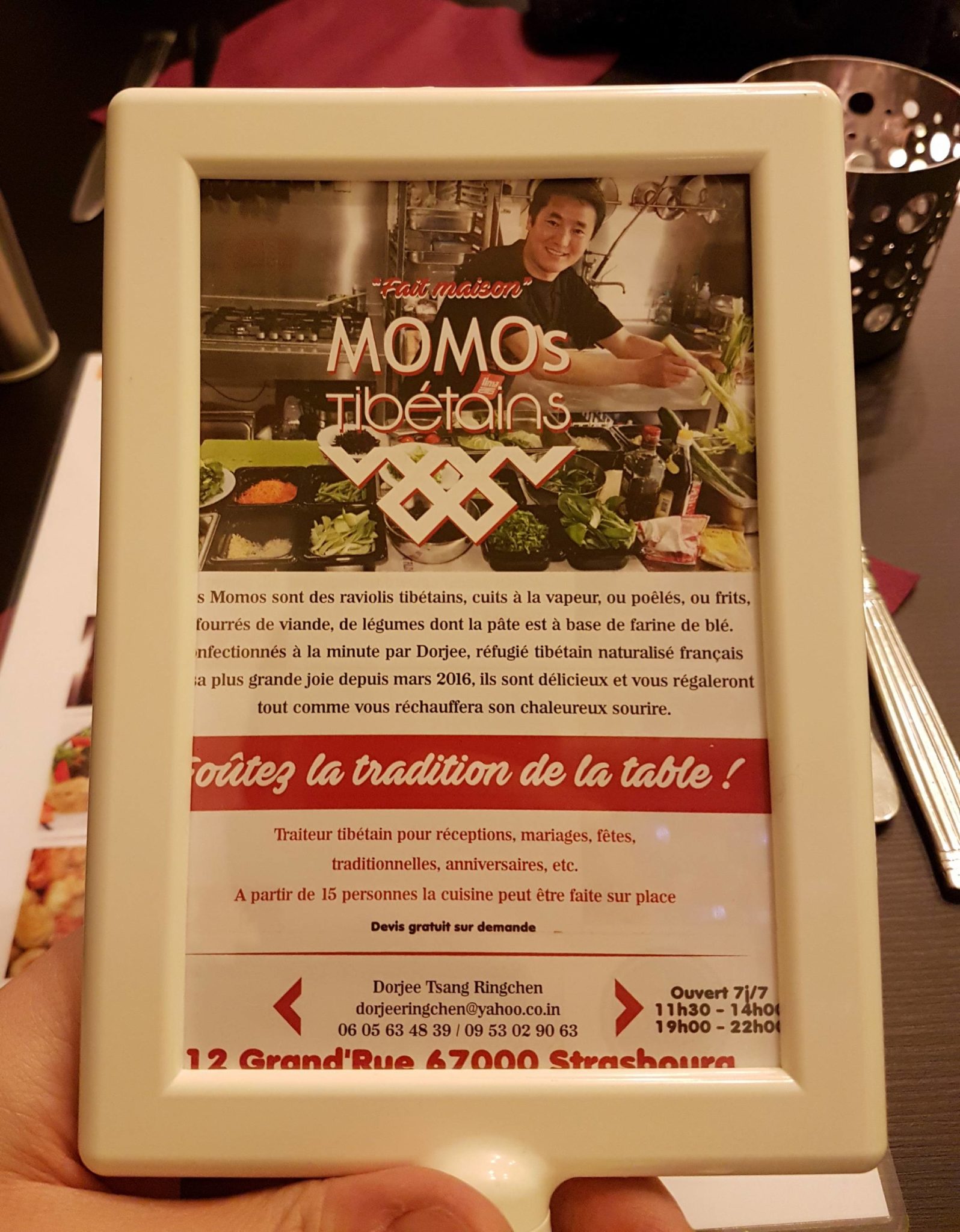 Dorjee R. est un cuisinier d’origine tibétaine qui vient d’installer en famille un snack traiteur pour les fans de la cuisine tibétaine dans la Grand Rue à Strasbourg. On y mange des momos : raviolis fourrés à la viande ou aux légumes à base de farine de blé. Ils sont cuits: soit à la vapeur, soit poêlés ou frits.